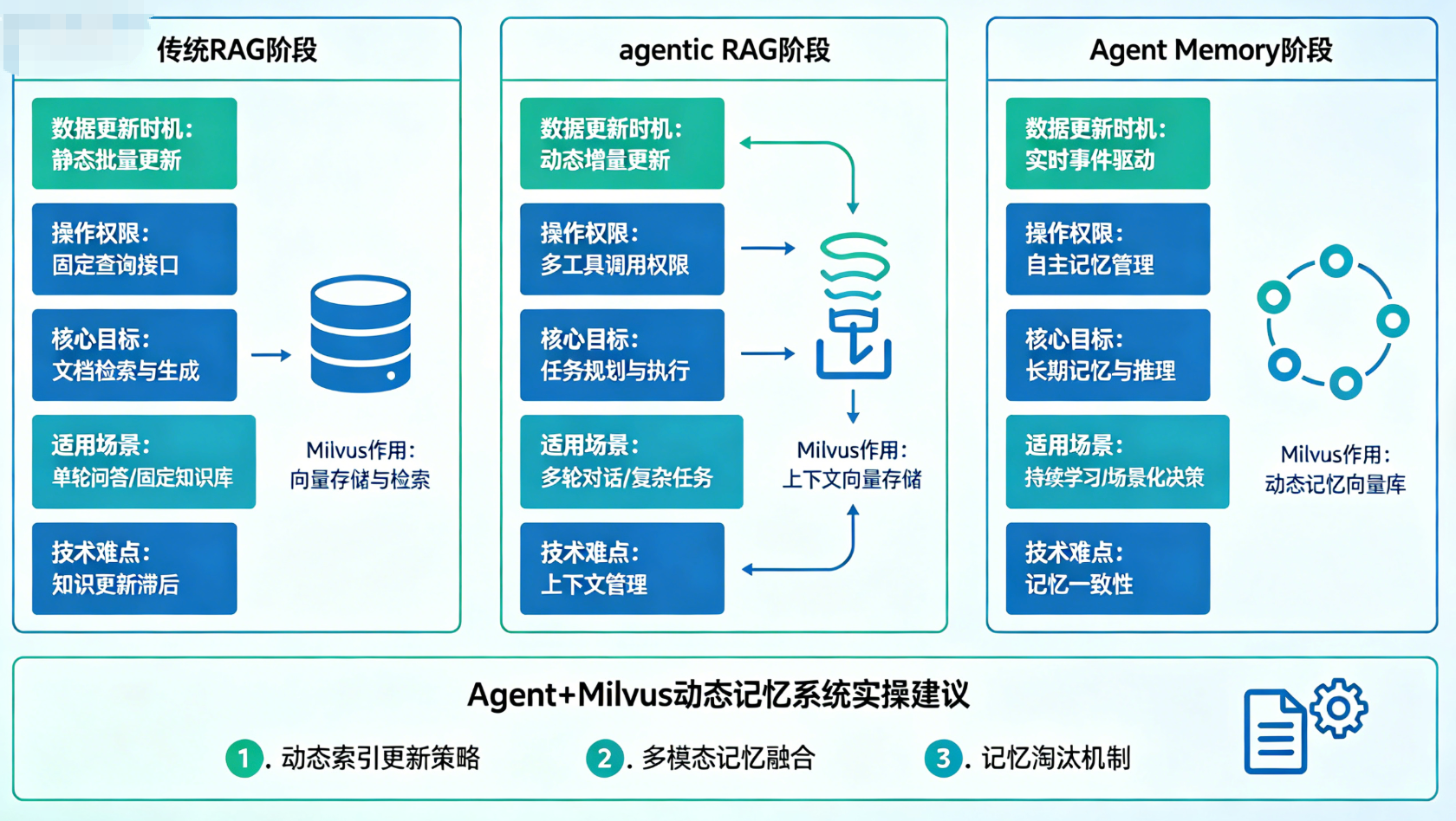 随着Agent技术的兴起,AI助手不再是简单的"问答机器",而是需要具备自主决策、动态学习、长期记忆的能力。这就要求我们跳出传统RAG的局限,从"只读的外部知识库"向"可读写的动态记忆系统"演进,而Milvus向量数据库,正是支撑这一演进的核心工具。
