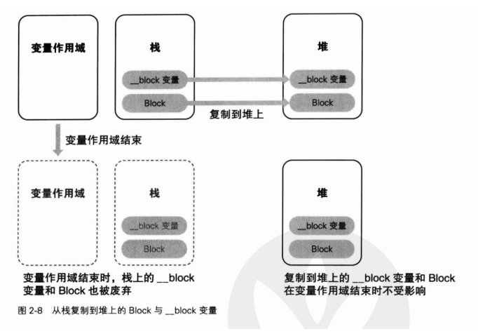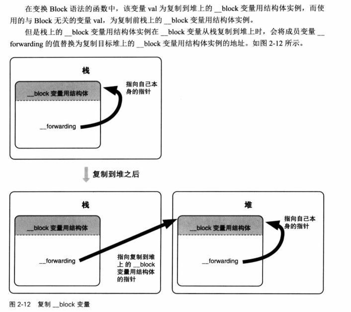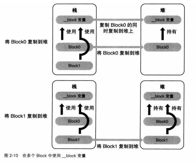 block变量为附有strong修饰符的id类型或者对象类型自动变量的情况下会发生相同的过程,当__block变量从栈复制到堆时,用Block_assign函数,持有赋值给 _ _ block变量的对象,当堆上的 _ _block变量废弃时候,使用Block_dispose函数,释放赋值给 _ _block变量的对象