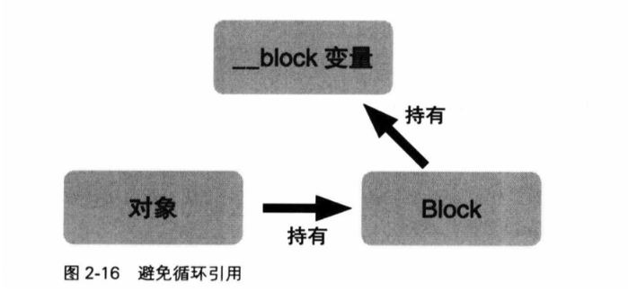 所以,即使对象赋值复制到堆上的附有 _ _ strong 修饰符的对象类型 _ _ block 变量中,只要_ block 变量在堆上继续存在,那么该对象就会继续处于被持有的状态。这与Block 中使用赋值给附有_strong 修饰符的对象类型自动变量的对象相同。