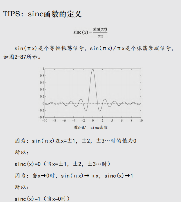 x≠0时:sinc(x) = sin(π×x)/(π×x);x=0时:sinc(x)=1(π≈3.1416)