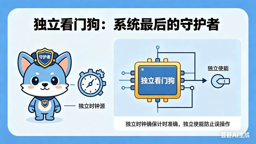 这个故事的启示, 为什么需要独立看门狗?因为系统时钟可能失效 。晶振坏了、PLL失锁、时钟配置错误------主时钟停了。但IWDG用独立的RC时钟,不受影响。它是"监工中的监工"。写在最后, 下次你做高可靠性产品,别只用窗口看门狗。想想独立看门狗。系统时钟停了,它还在倒计时。系统最后的"守护神"。