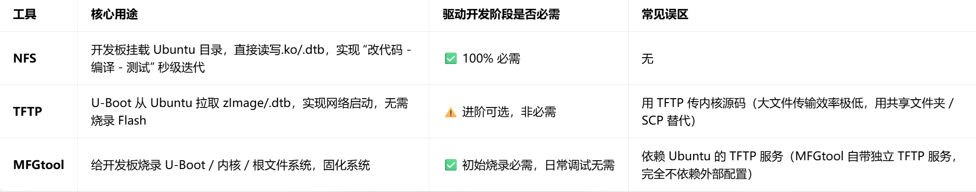 常见的文件传输功能有TFTP和NFS,但是TFTP是一种服务,每次都需要手动敲命令才能传输,而NFS则是将一方的文件系统挂载在另一方文件系统下,只要更新就自动被另一侧感知到。如果频繁的修改文件,则NFS的高效、简便性则大大凸显。所以我们会选择NFS进行驱动开发。