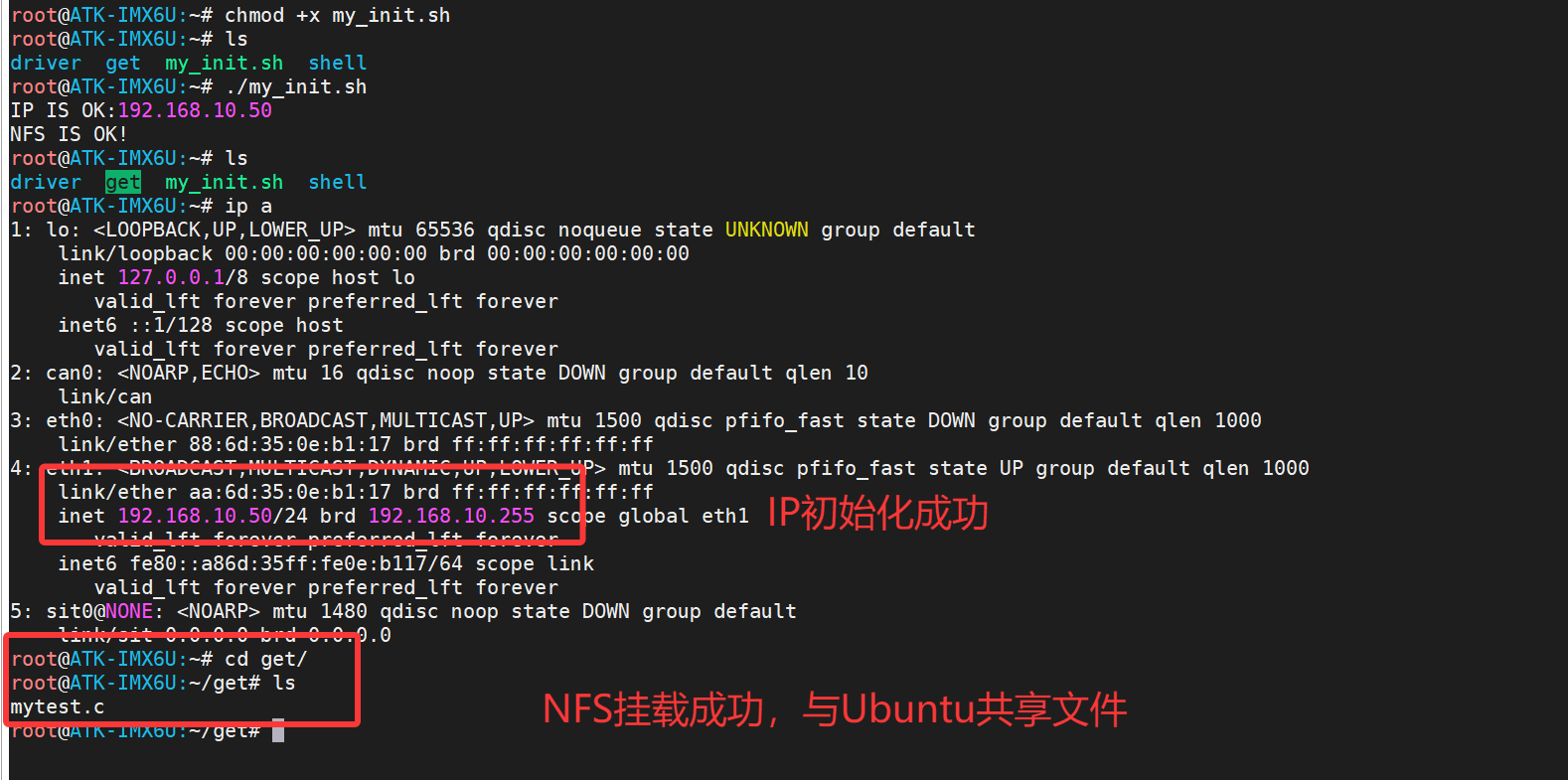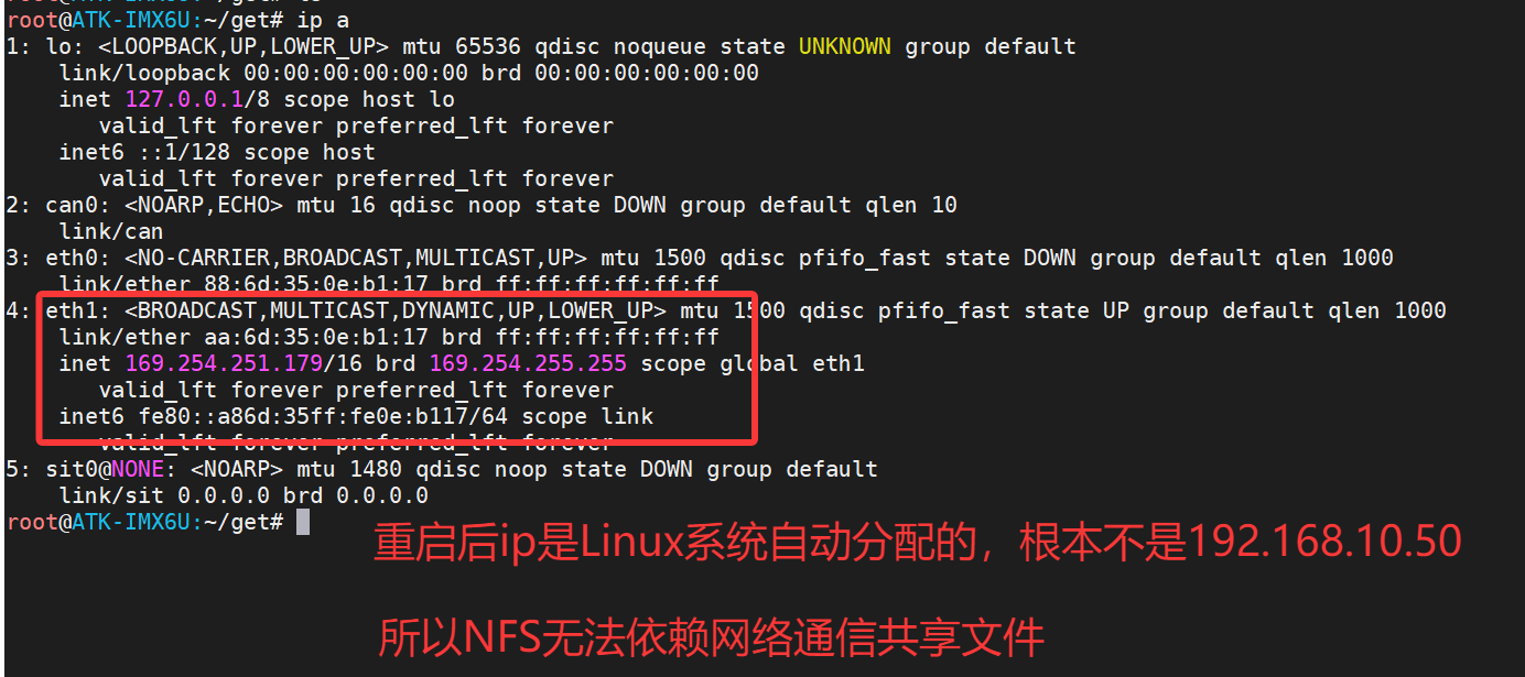 经过查阅资料,发现是rcS脚本运行的太早了,很有可能网卡还没完成IP分配,网络还没连通,挂载命令就先执行了,所以执行失败,直接跳过。也有可能是我们之前在给开发板配置静态IP的时候,图方便没有给他配置到文件中,而是每次进入Linux系统后再手动配置的ip。而NFS是网络文件系统,他能共享文件的前提是能与Ubuntu系统网络通信,此时没有配置永久静态IP,NFS就无法运行。