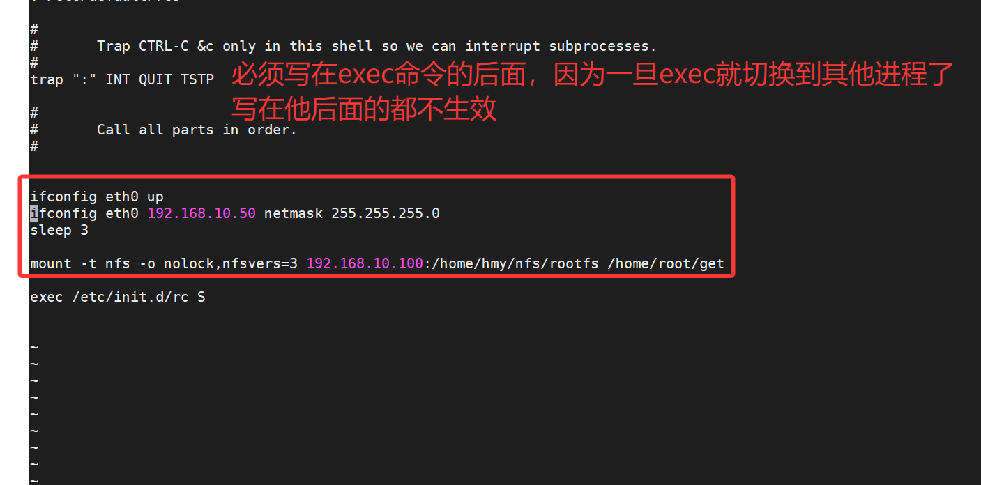 依旧打开刚刚文件,由于/etc/init.d/rcS是执行的第一个用户态进程,由内核自动执行。我们通常也称他为开机脚本,一般要手动写的配置代码都会放到这里面去。写在exec之前即生效配置。