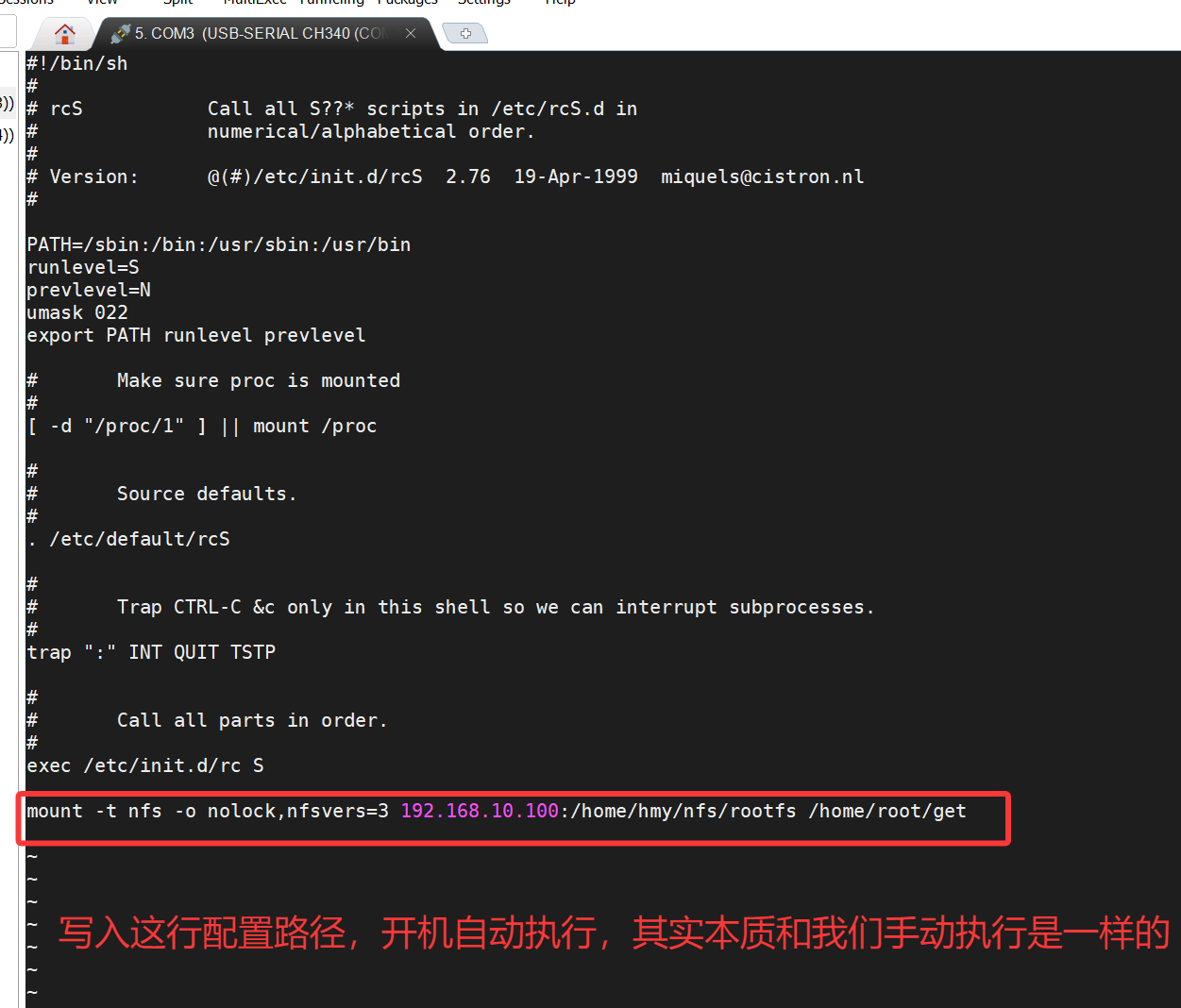 于是我们现在对开发板进行设置开机自动挂载NFS系统。