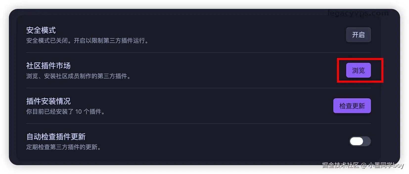 第一步:先开 Obsidian 第三方插件:设置 → 第三方插件 → 关掉安全模式