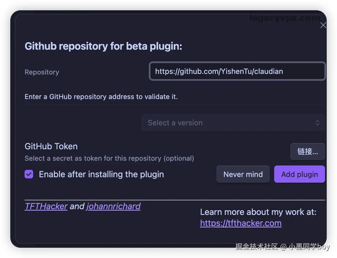 然后用 BRAT 拉 Claudian:左侧列表进 BRAT → Add beta plugin → 粘这个地址: