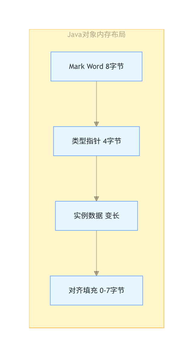 Mark Word:固定8字节,存储对象的哈希码、GC分代年龄、锁状态标志、线程持有的锁等信息。