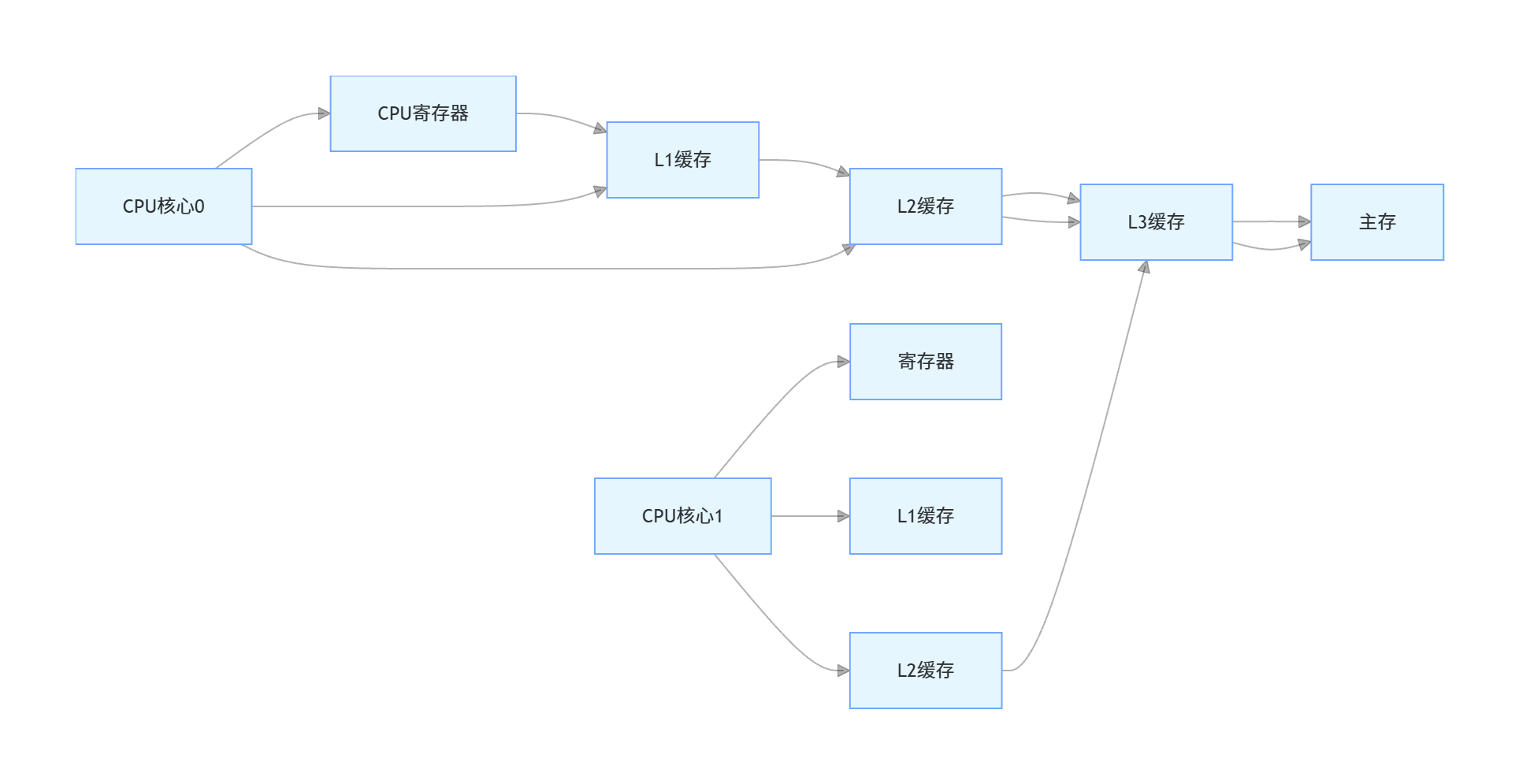 现代计算机体系中,CPU的运算速度与主存的访问速度存在数量级的差距:CPU寄存器的访问延迟约1纳秒,L1级缓存访问延迟约1纳秒,L2级缓存约3纳秒,L3级缓存约10纳秒,而主存的访问延迟高达100纳秒左右。这意味着CPU访问一次主存的时间,足够执行上百条运算指令。
