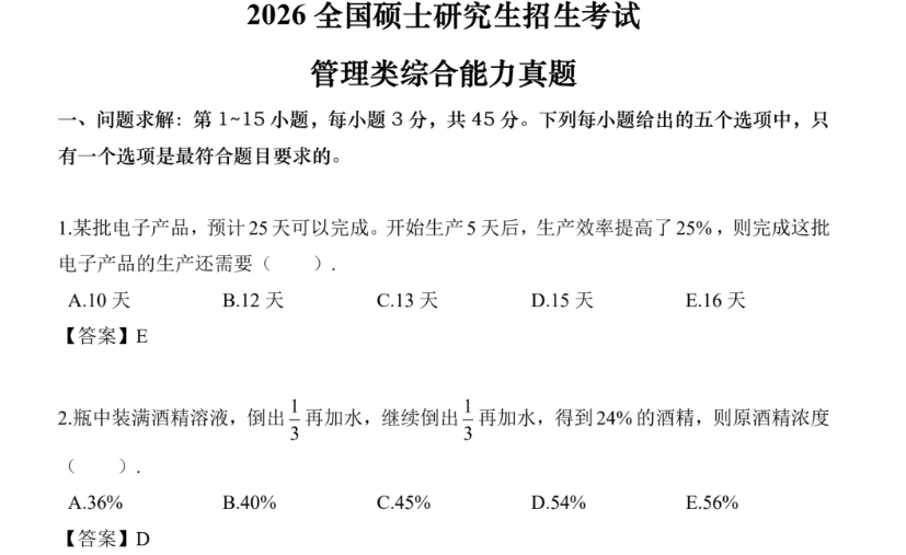 适用对象: 管理类联考备考考生 需要真题模拟练习的用户 考前冲刺阶段复习需求