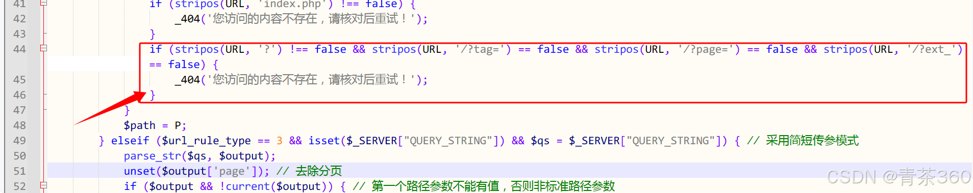 💡 说明:原逻辑是"参数如果不在白名单就 404错误",现在通过 `stripos(URL, '/?bd_vid') == false` 参与判断,这样 `?bd_vid` 参数在白名单里就不会触发 404错误了。