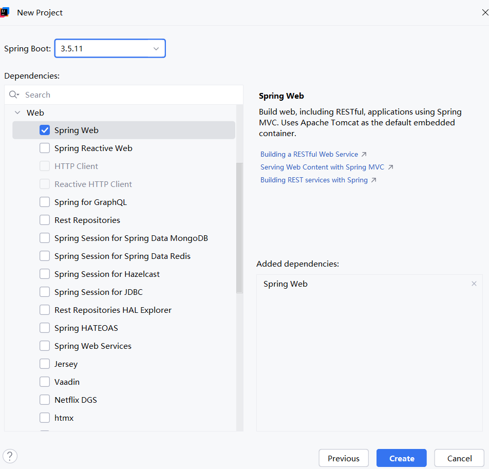 Spring MVC 项目创建和 Spring Boot 创建项目相同,在创建的时候选择 Spring Web 就相当于创建了 Spring MVC 的项目