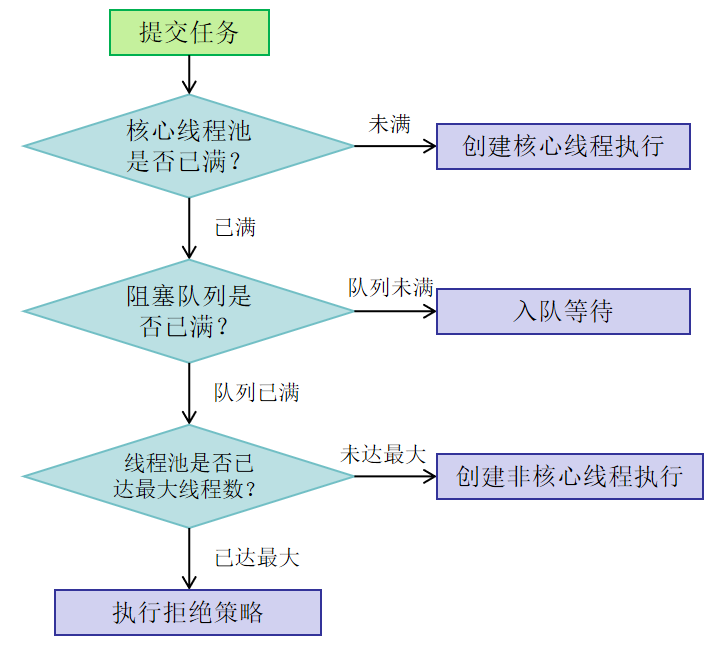 线程池包含核心线程数、最大线程数以及一个任务等待队列。