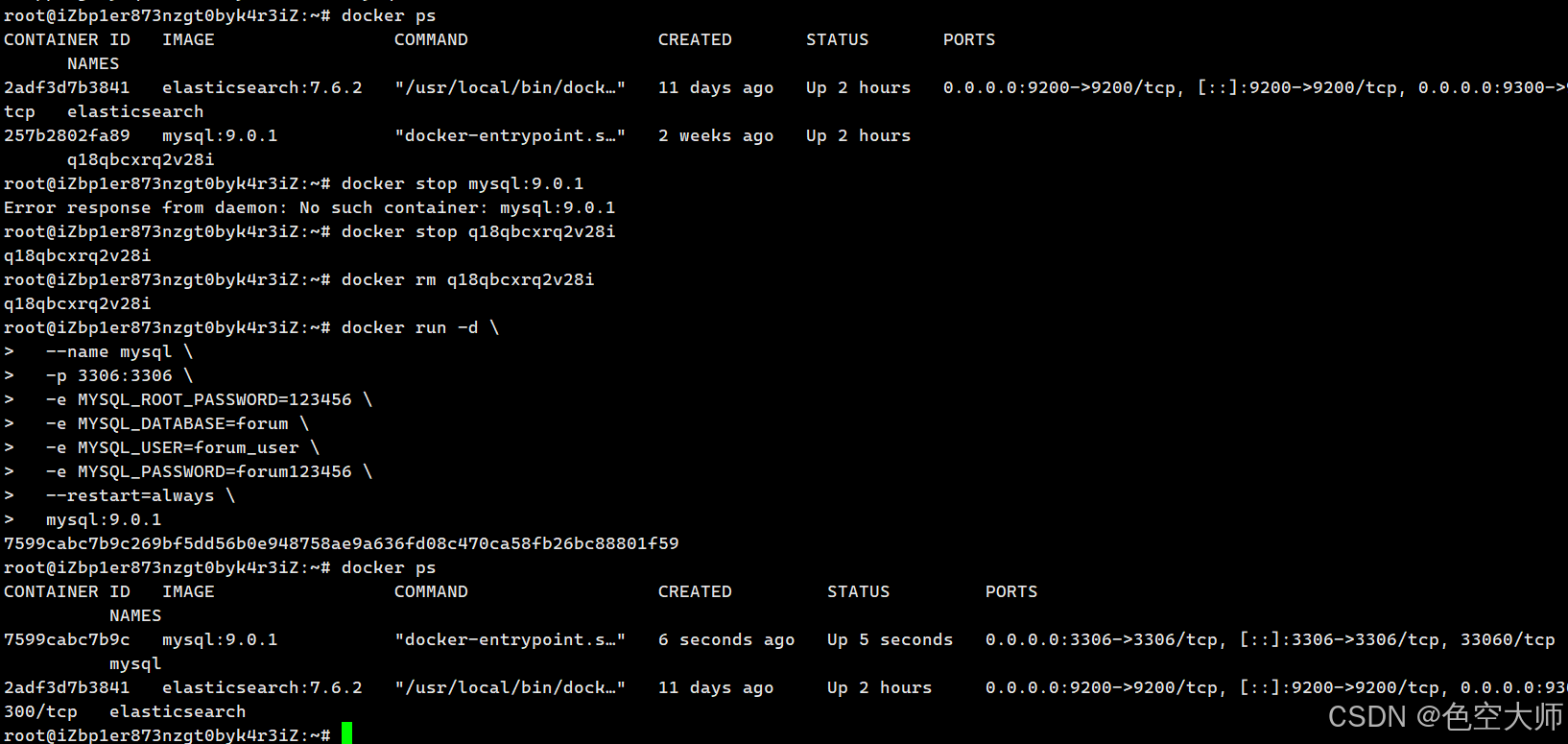 我的只有系统的,那就关闭系统的mysql,docker的mysql没有端口映射,删除容器后重新启动