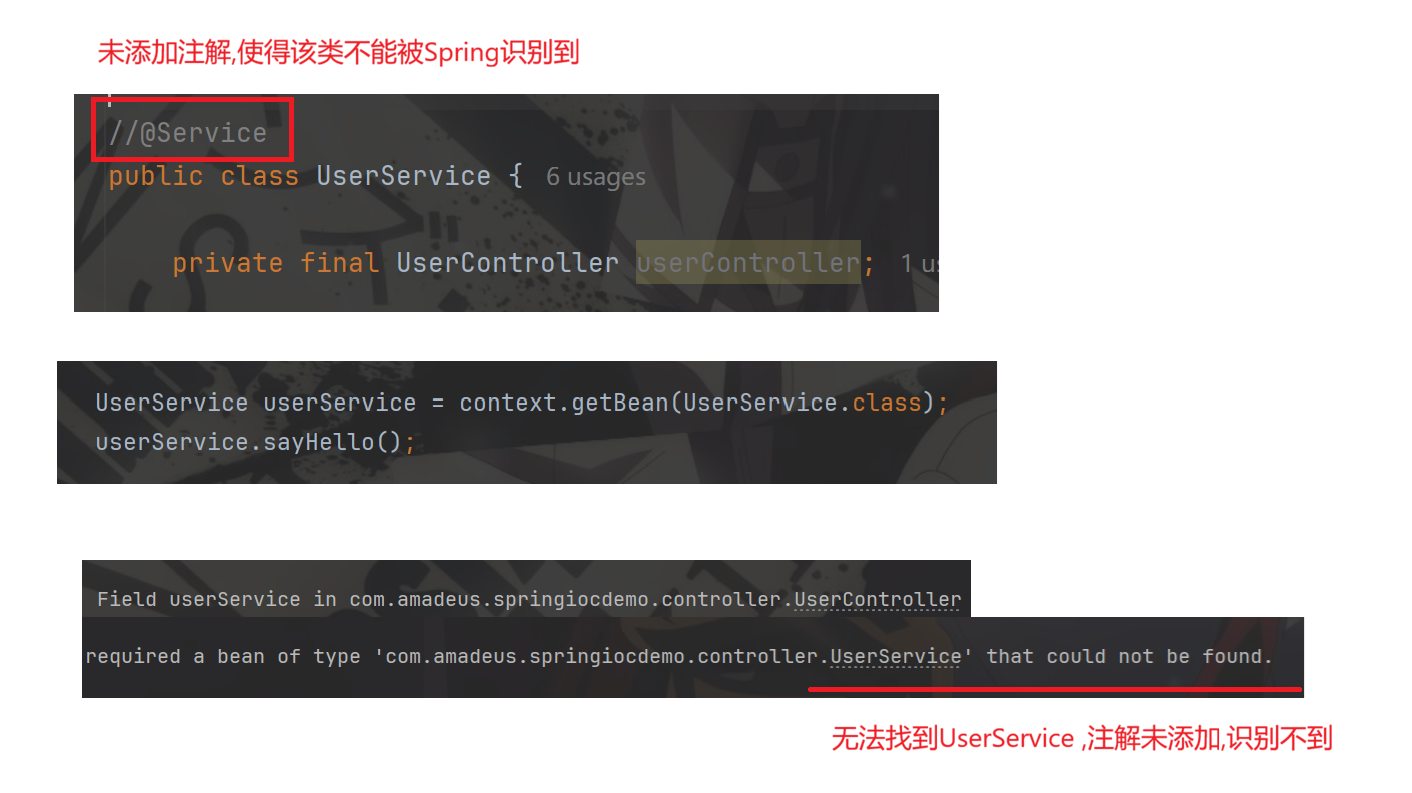 如果不再对应的类中添加注解,尝试从Spring容器中获取Bean 对象就会出现报错,