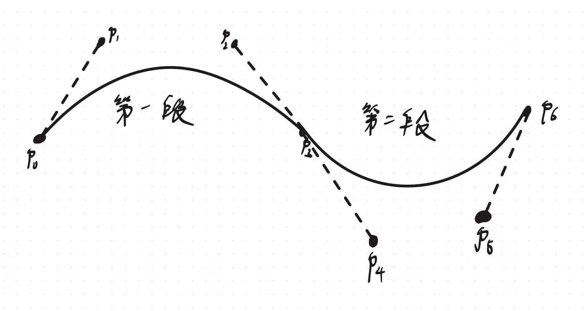 和之前的没啥区别,因为第一段曲线"自由",你可能理解不了为什么说他自由,咱们继续往下看第二段曲线。为了保证端点处C1的连续性,它在连接点p3的斜率其实是不自由的,必须等于第一段曲线在该点处的斜率,如下图所示: