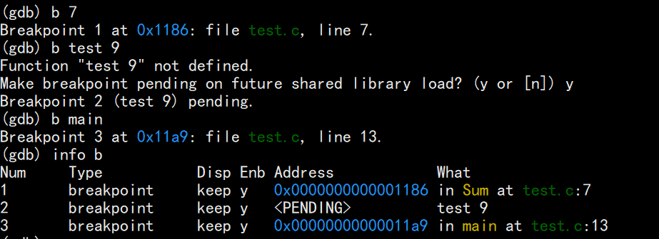 断点编号用info breakpoints查看,删除时必须用编号,不能用行号。