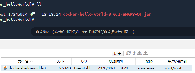 在linux服务器创建文件夹,并将打包好的jar包上传至文件夹中,比如 docker_helloWorld