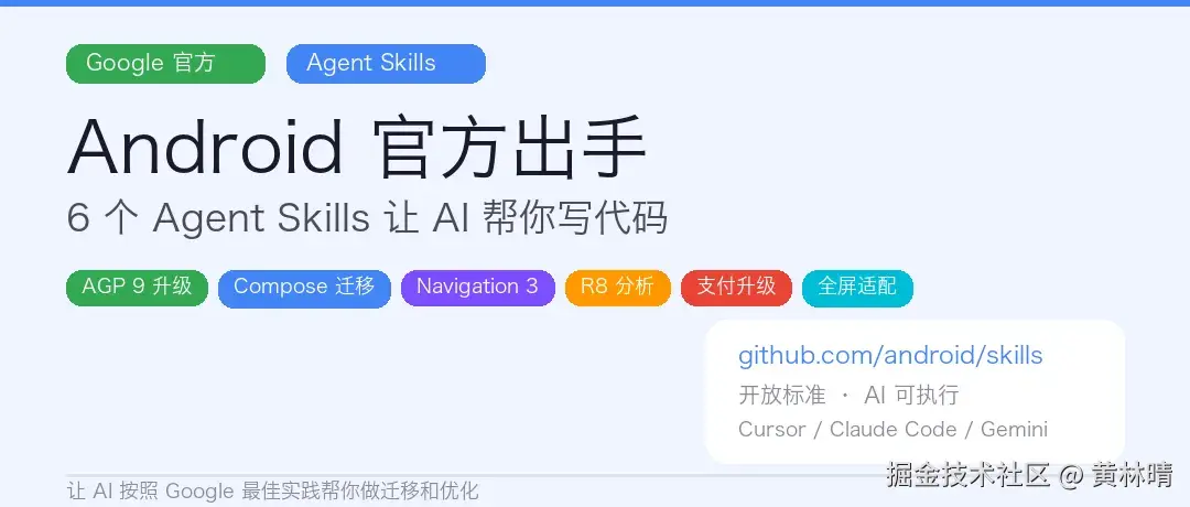 近日,Google 在 GitHub 上开源了 android/skills 仓库,目前里面放了 6 个官方维护的 Agent Skills,覆盖构建升级、Compose 迁移、导航框架、性能优化、支付升级和全屏适配。