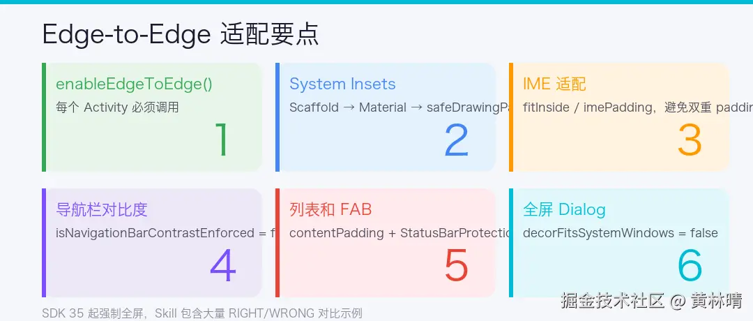 此外还覆盖了:Adaptive Scaffold(NavigationSuiteScaffold)的注意事项、导航栏对比度和系统栏图标颜色、列表滚动到系统栏后面时的半透明保护层、全屏 Dialog 的 edge-to-edge 处理。