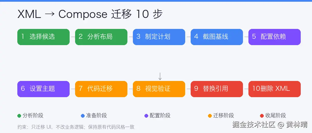 验证收尾:对比迁移前后的 UI 截图,确认视觉一致 → 编写 Compose UI 测试 → 替换所有引用 → 删除旧 XML 文件和相关测试。