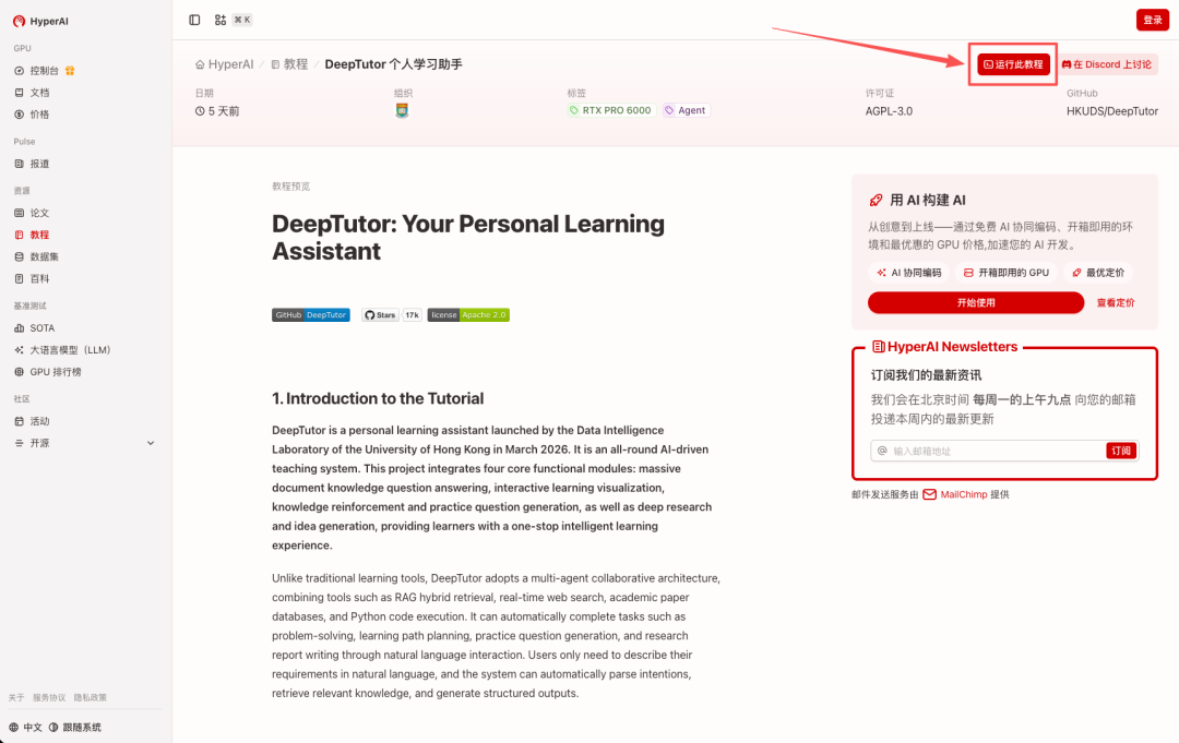 1.进入 hyper.ai 首页后,选择「教程」页面,或点击「查看更多教程」,选择「DeepTutor 个人学习助手」,点击「运行此教程」。