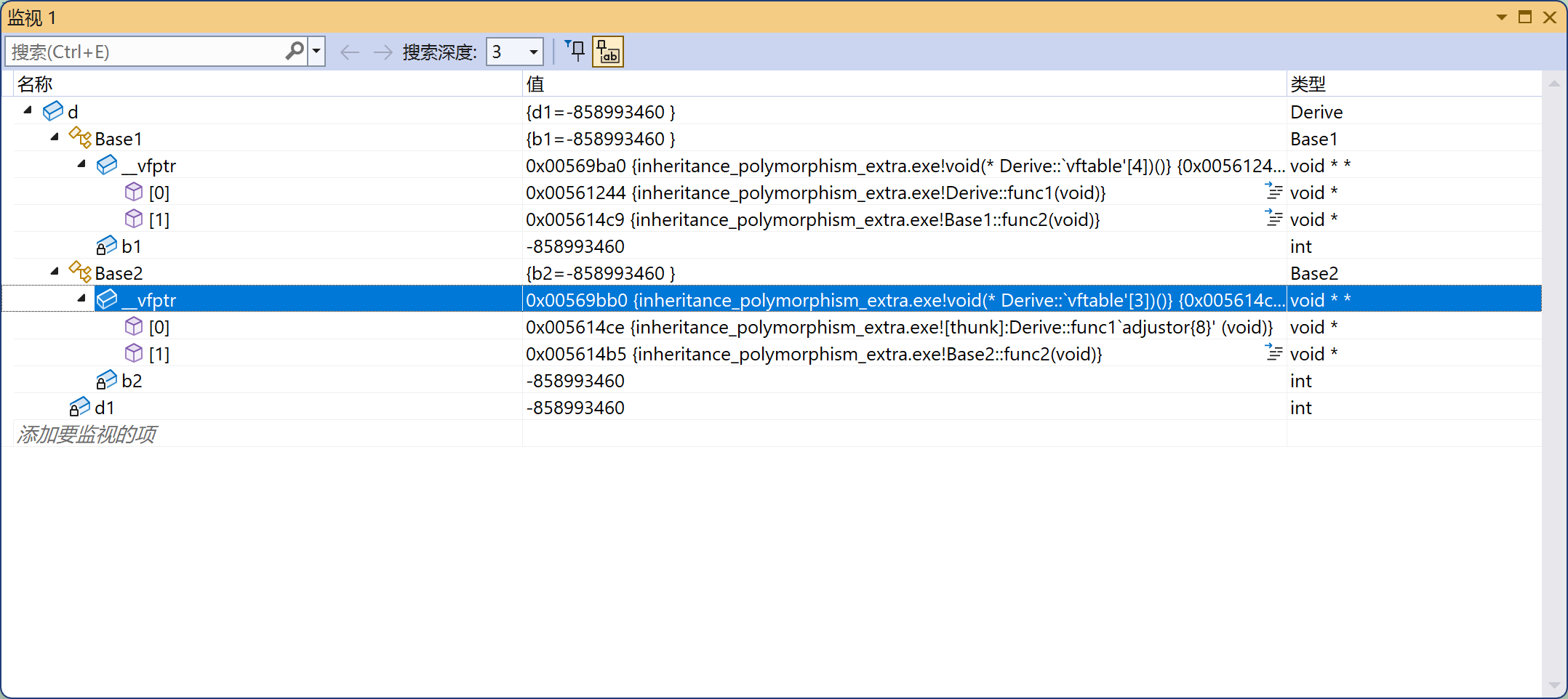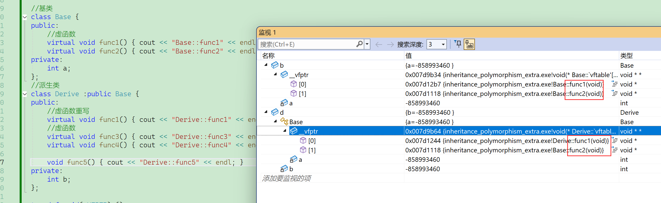 通过内存观察虚表,也不确定存储的是不是func3,所以还是通过调用虚表函数指针的方式。