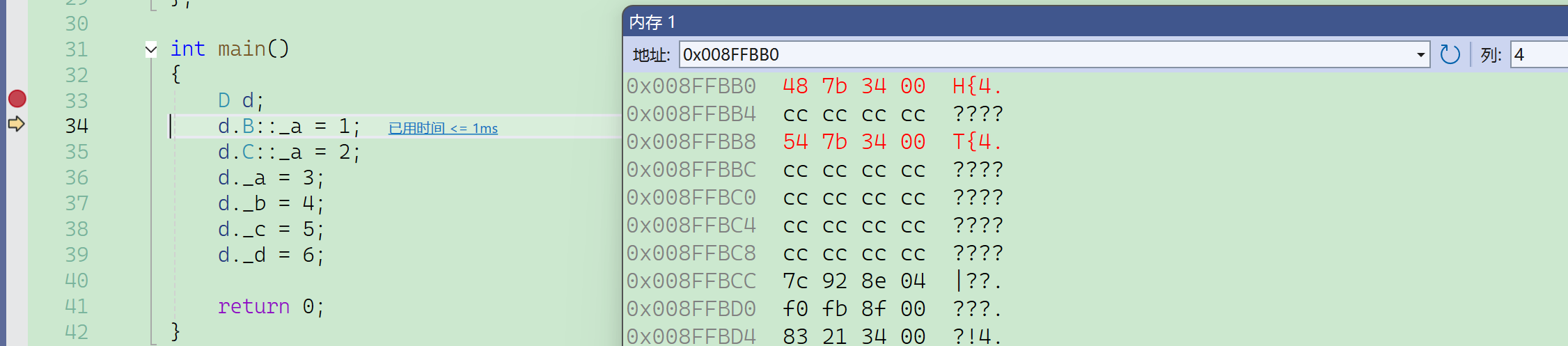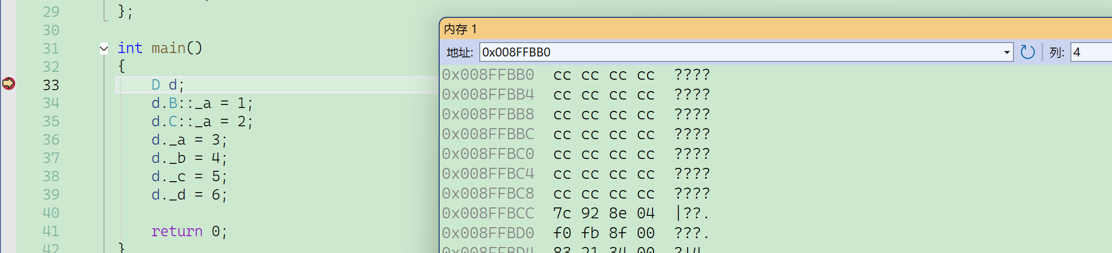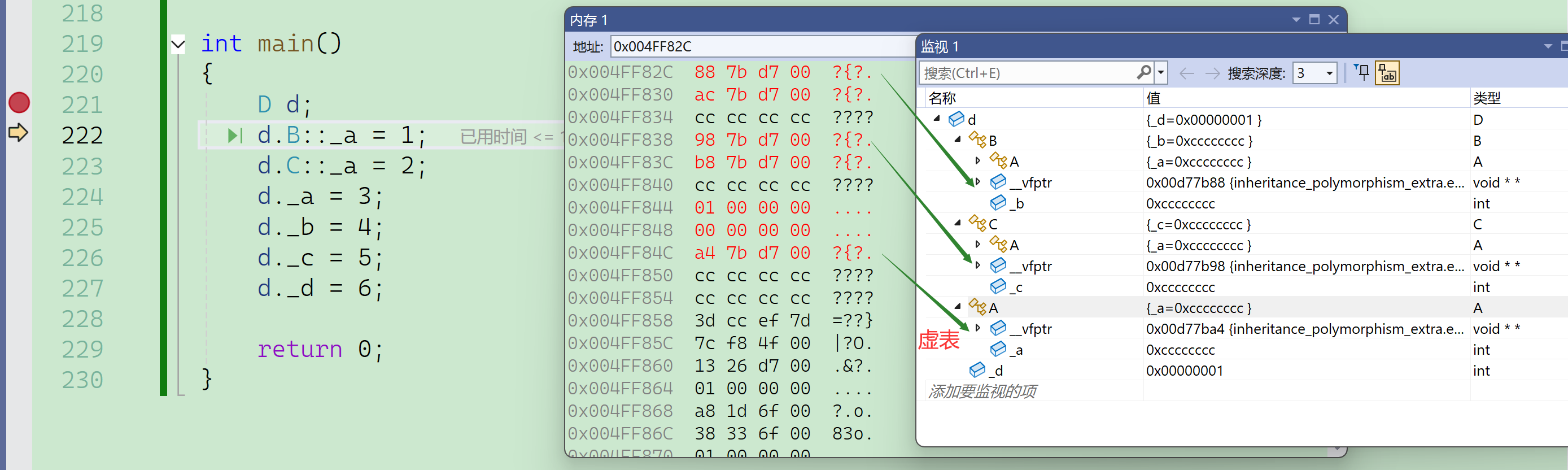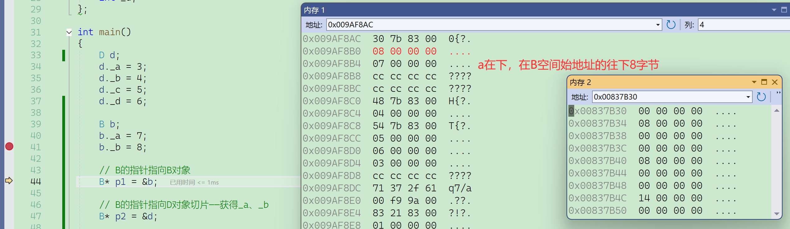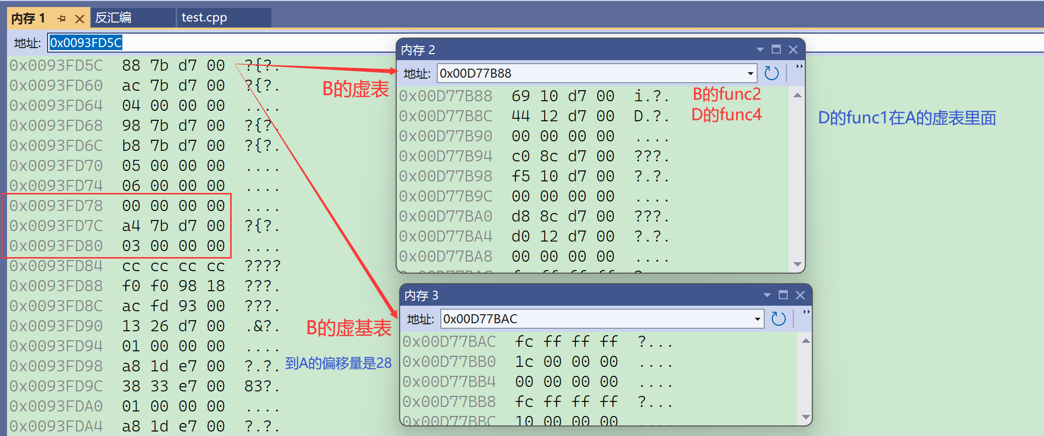 要注意的是这里必须借助内存窗口才能看到真实的底层对象内存模型,vs编译器的监视窗口是经过特殊处理的,以它的角度给出了一个方便看的样子,但并不是本来的样子。