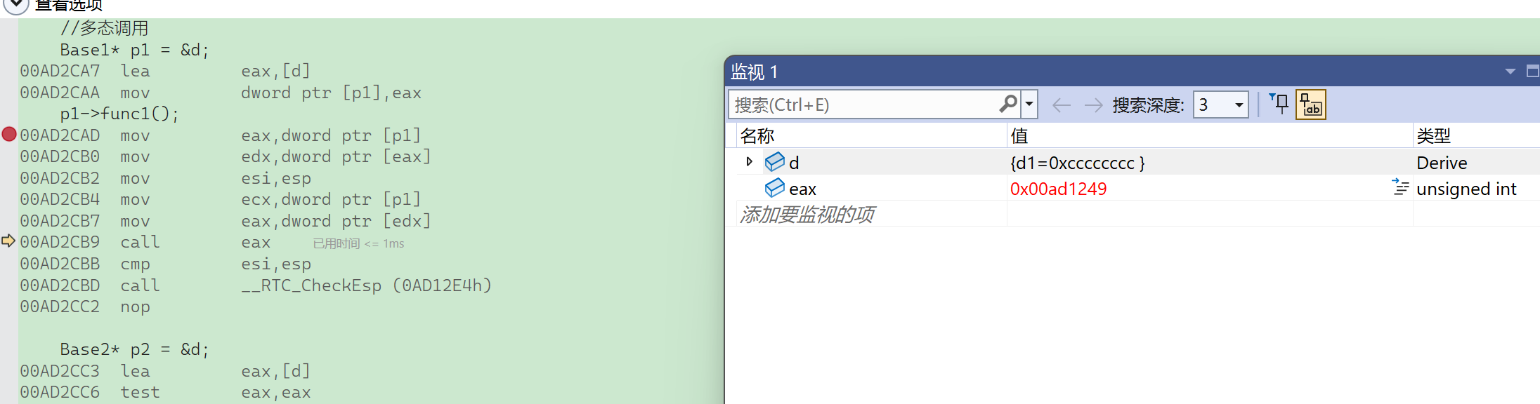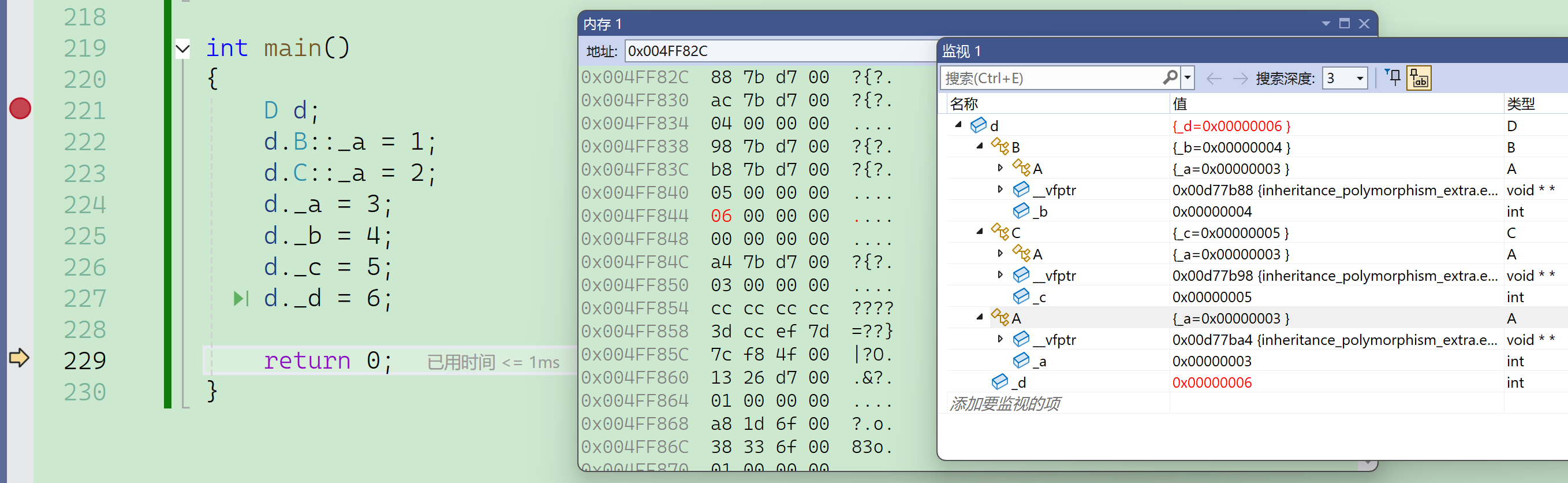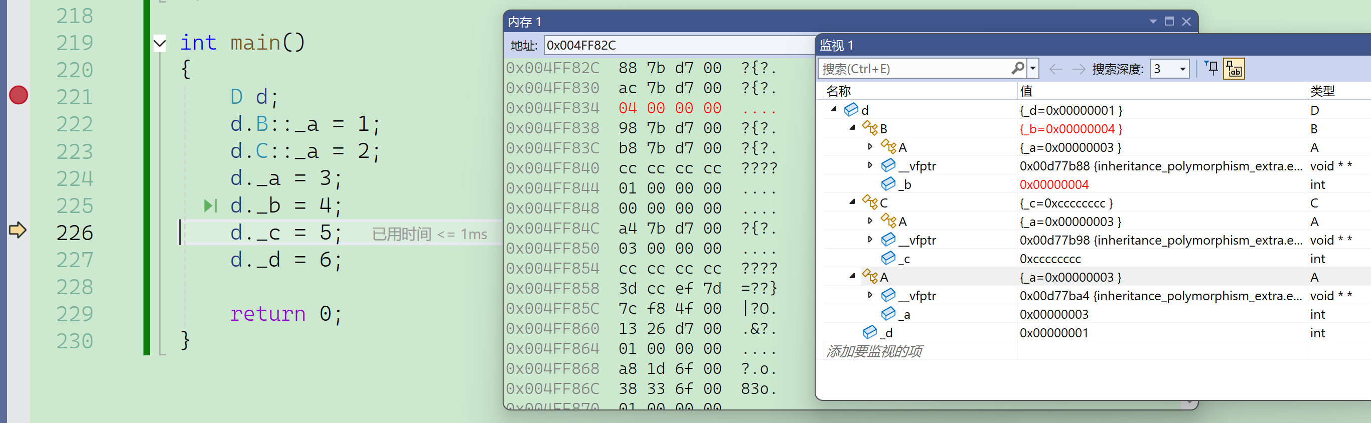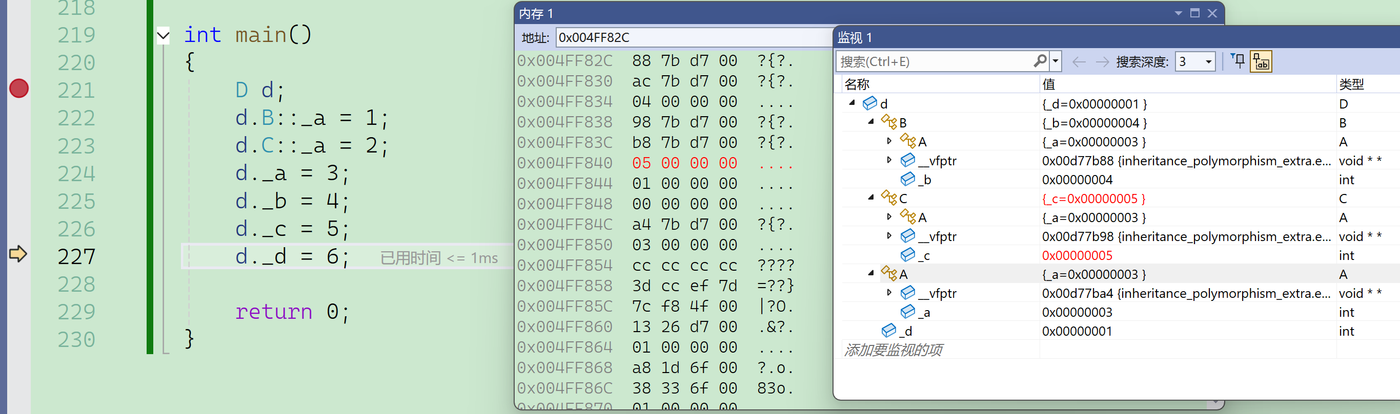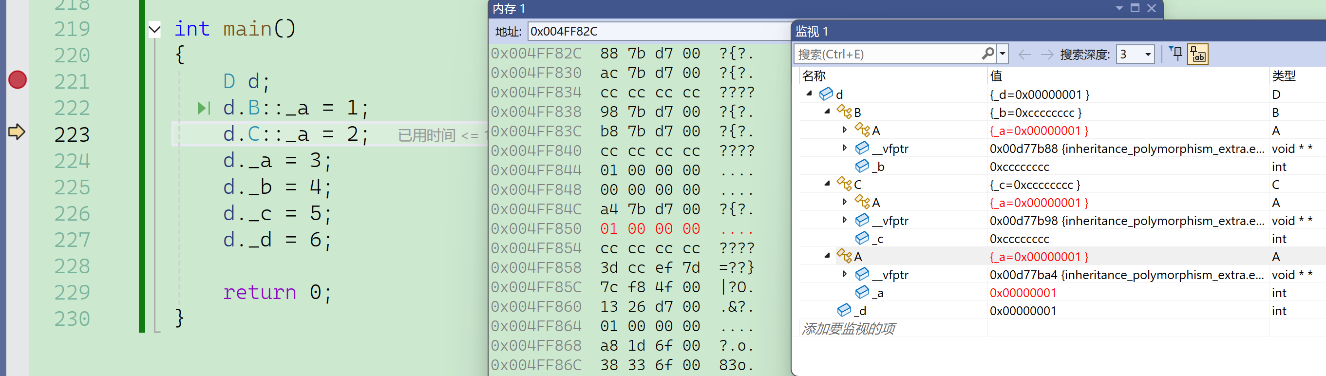 要注意的是这里必须借助内存窗口才能看到真实的底层对象内存模型,vs编译器的监视窗口是经过特殊处理的,以它的角度给出了一个方便看的样子,但并不是本来的样子。