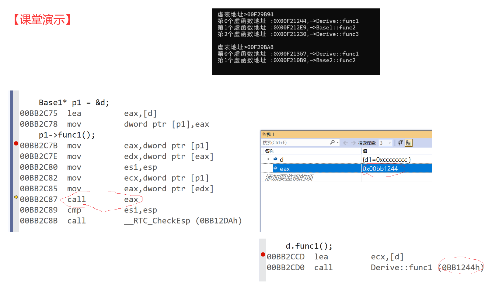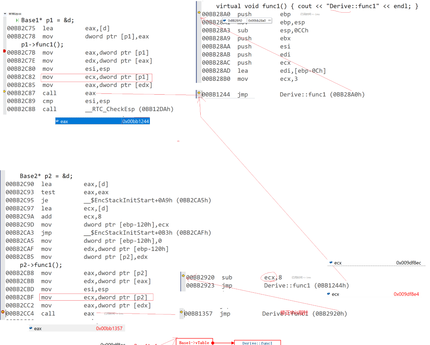 其实Base1的虚表func1地址和Base2的虚表func1地址都能去到jmp(func1)指令。