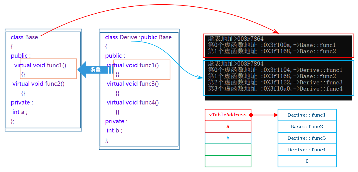 - 重写了的虚函数项:覆盖父类虚表的对应项
