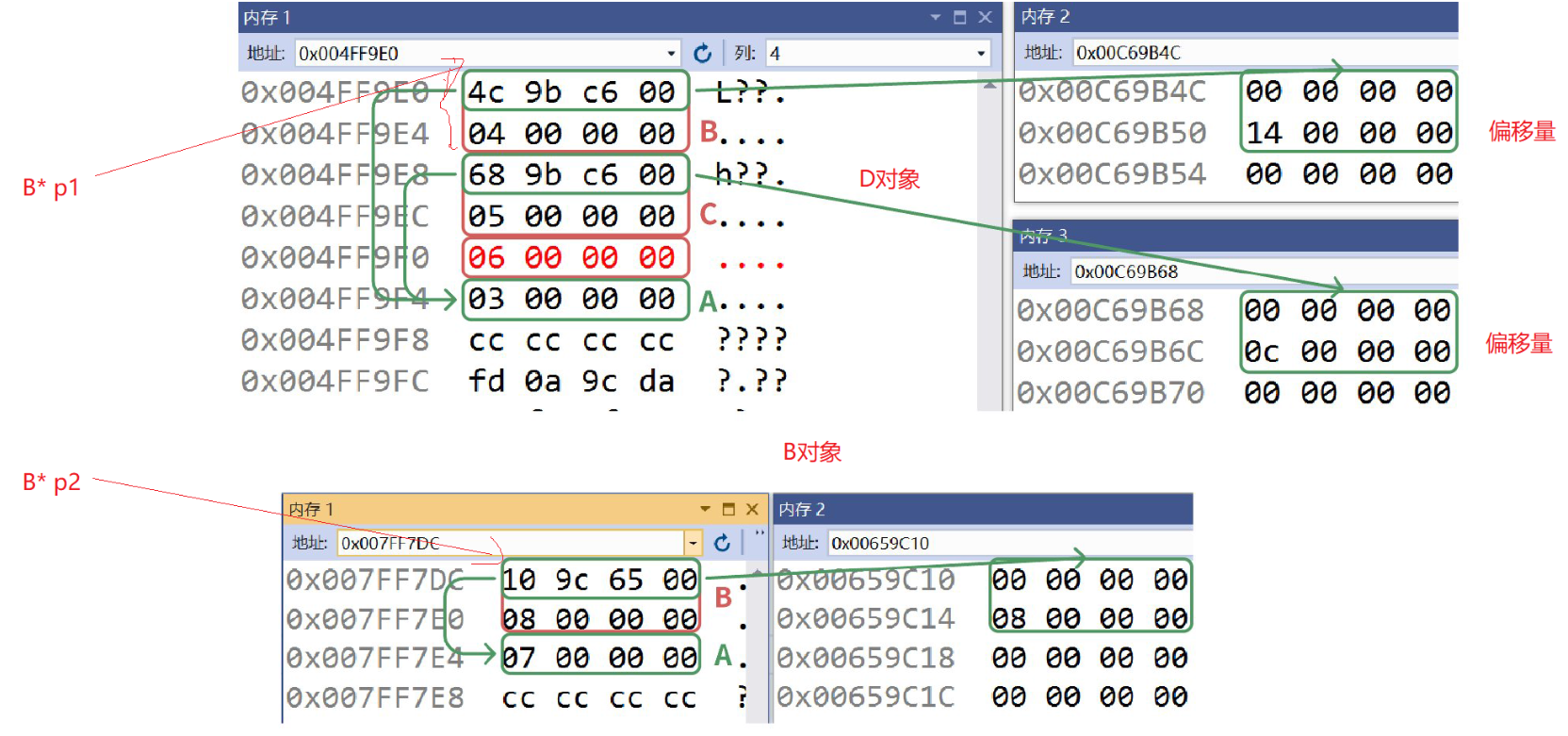 fc ff ff ff是-4,表示B的虚基表到B的虚表的偏移量。