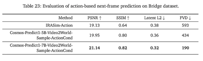 Cosmos 在虚拟物理引擎(PhysX + Isaac Sim)生成的基准数据集上进行验证,确保生成的视频遵循牛顿力学和刚体动力学规律(将模型生成的视频与虚拟物理引擎渲染出的视频进行比较)。