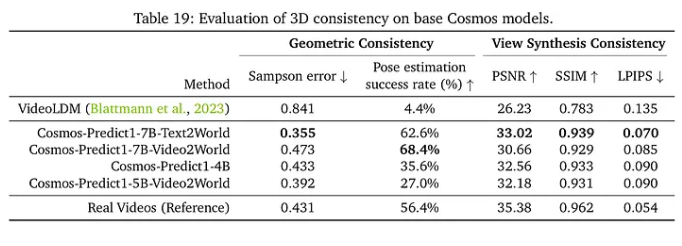 理想的WFM应能从几何上合理的3D世界生成视频模拟。Cosmos针对RealEstate 10K中的静态场景进行评估,并与VideoLDM进行比较。在几何一致性方面,Cosmos评估了生成视频各帧之间的对极几何约束 是否被满足,以及姿态估计的成功率。此外,在视图合成一致性部分,评估了各生成图像的3D结构一致性。