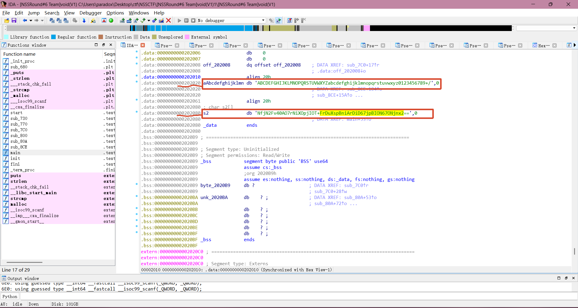 可以看到自定义 base64 编码表和硬编码的 s2 的偏移量分别是 0x00202020 和 0x00202080