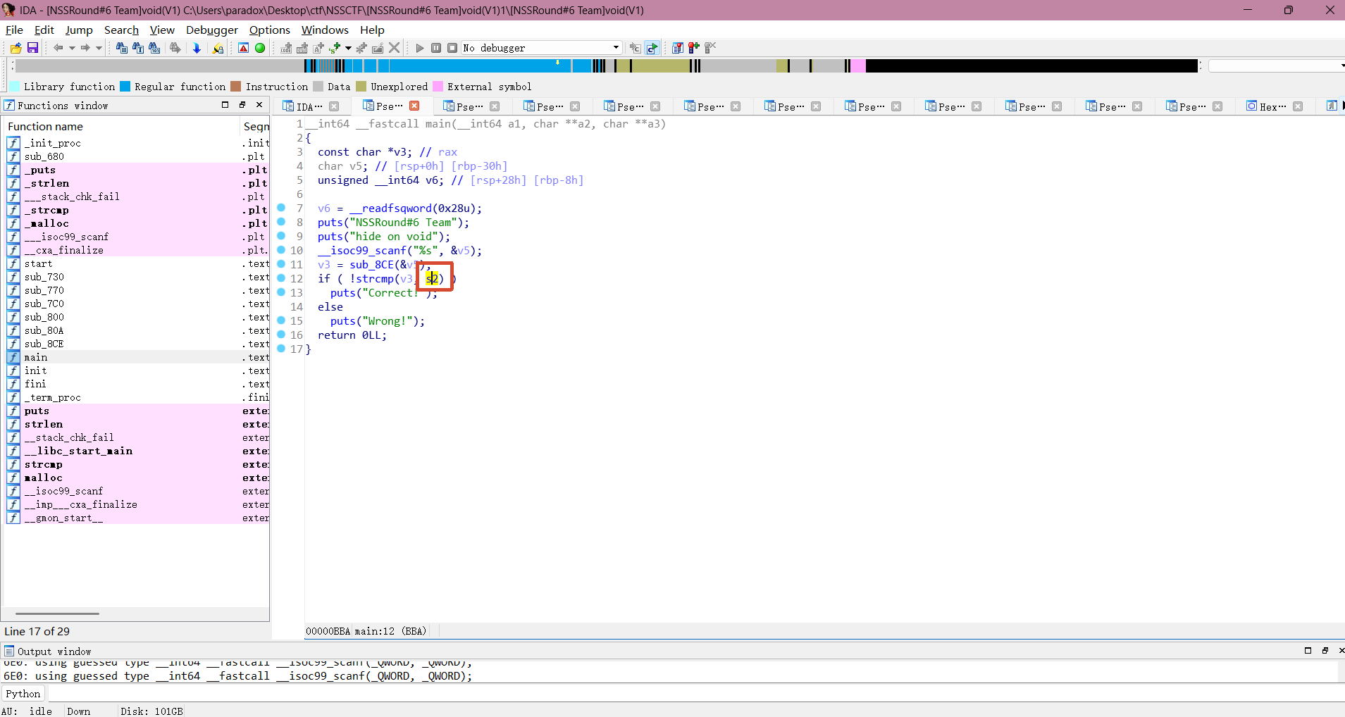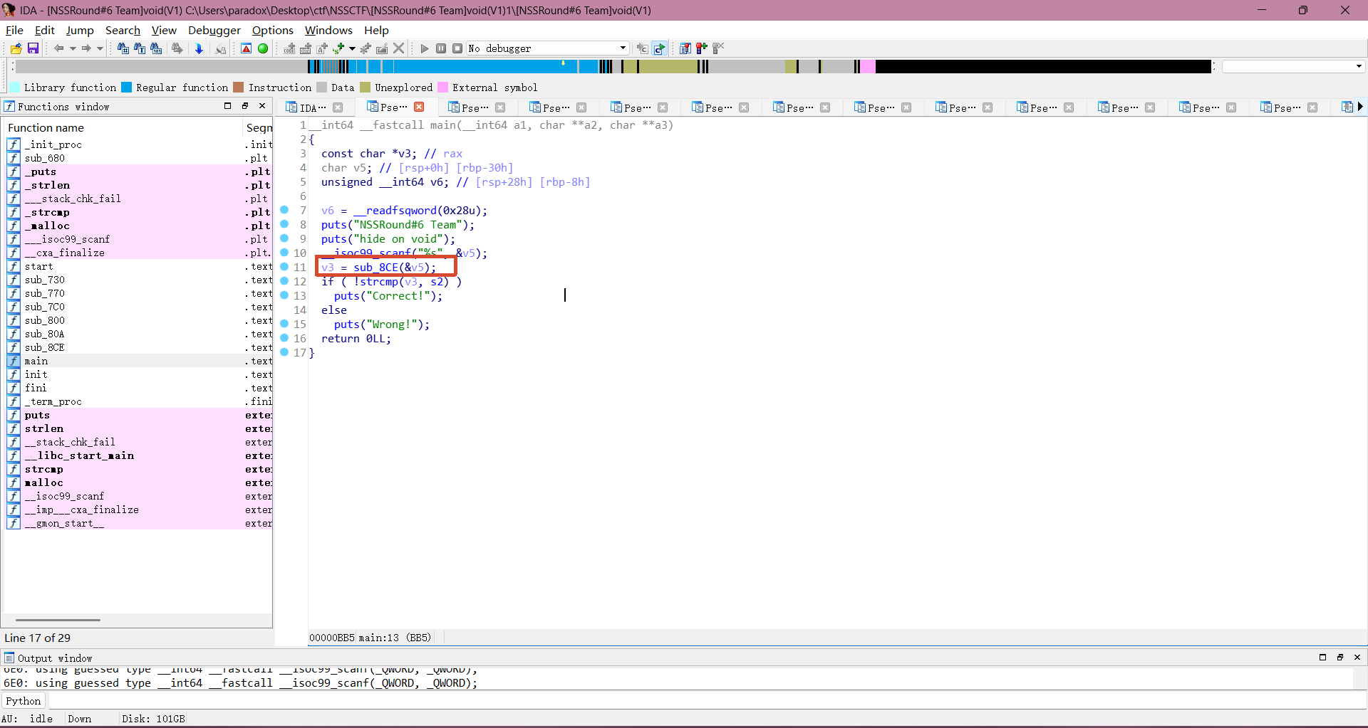 先用 ida64 打开程序进行静态分析,查看 main 函数逻辑,可以的得知这里的逻辑是将用户输入传给 sub_8CE 函数处理过后,赋值给 v3 ,之后 v3 与 s2 做比较。