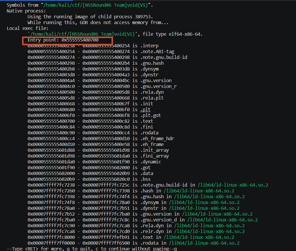 可以得知程序的基地址是:0x555555400000(因为程序的基地址必须是 0x1000 对齐的,所以最后三位直接抹零,0x0000555555400700 - > 0x0000555555400000)