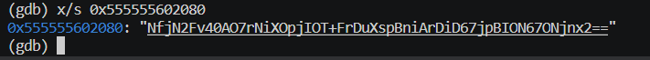 真实地址 = 基地址 + 偏移量,得到硬编码 s2 的真实地址是 :0x555555400000+ 0x00202080 = 0x555555602080 。base64编码表的真实地址是:0x555555400000+ 0x00202020 = 0x555555602020 。这两个地址待会用于查看内存的值。