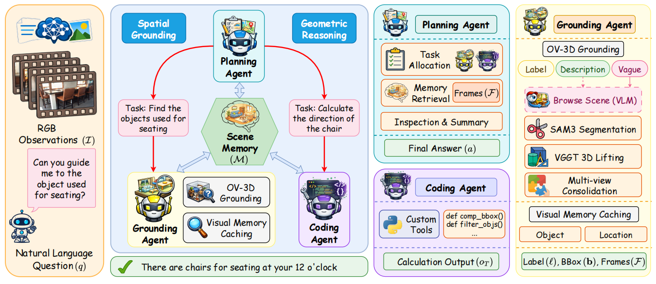 - 构建无需训练、可动态协同的多智能体框架,让现成视觉语言模型具备可靠的三维具身推理能力。
