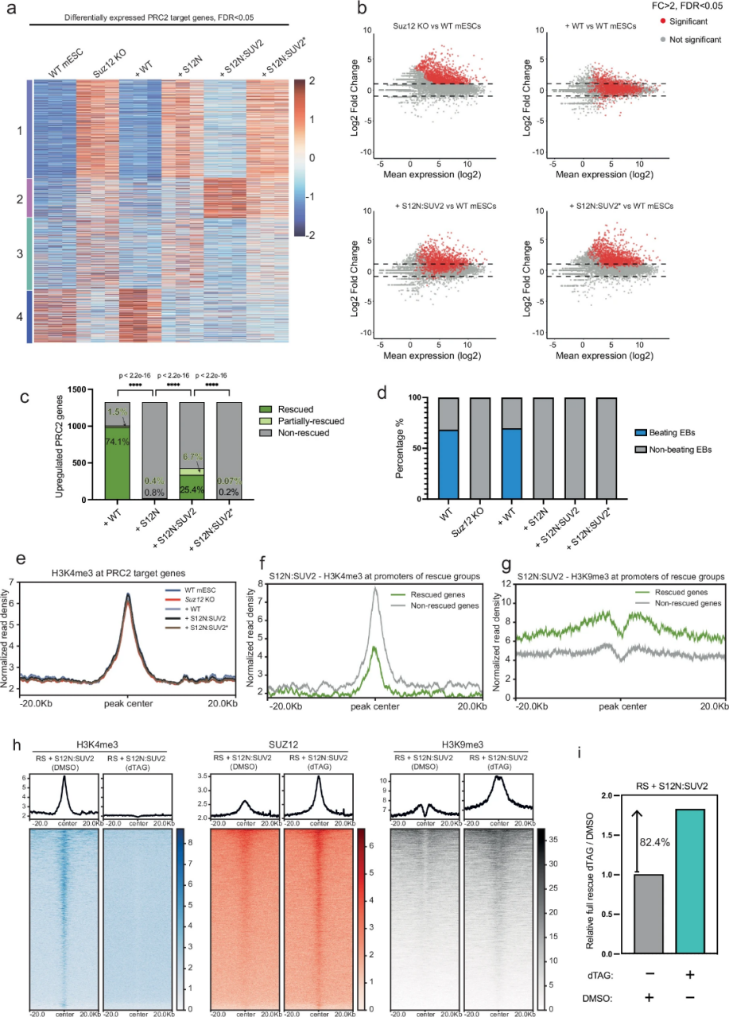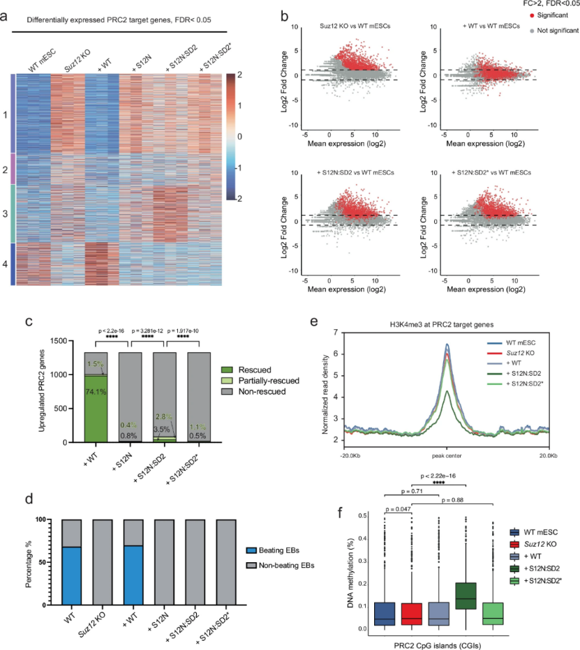为评估H3K36me3的功能效应,研究者进行了RNA-seq分析。K-means聚类(K=4)显示,Suz12 KO导致PRC2靶基因广泛去抑制,而野生型SUZ12重建可完全恢复基因表达至野生型水平(图3a)。然而,令人惊讶的是,尽管S12N:SD2在全基因组范围内准确重建了H3K27me3分布模式,却未能普遍抑制PRC2靶基因(图3a)。在SUZ12缺失导致的1326个去抑制PRC2靶基因中,重新表达全长SUZ12(恢复H3K27me3)可以挽救74.1%基因表达,而S12N:SD2(沉积H3K36me3)仅能完全挽救3.5%(图3b-c)。功能实验发现S12N:SD2未能恢复mESC的正常分化能力,类胚体形成实验显示其无法产生跳动的心肌细胞团(图3d),与Suz12 KO细胞类似。