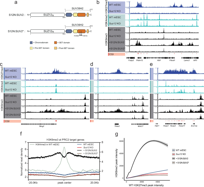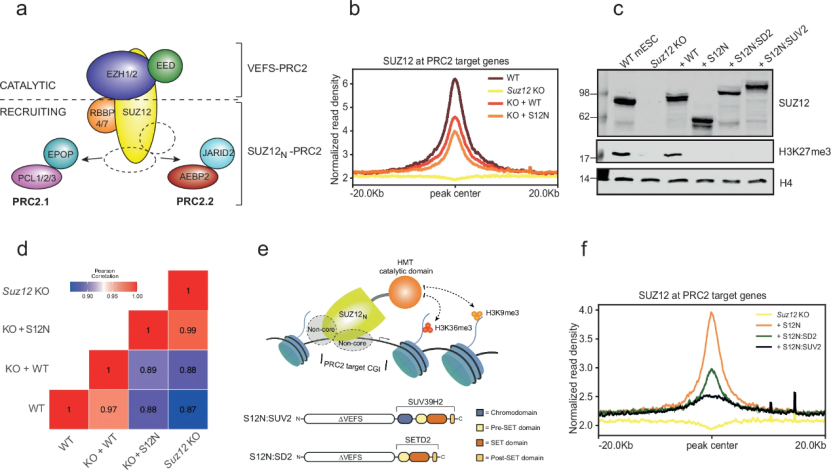 本研究首先基于PRC2模块化结构验证用于靶向招募异源酶活性的可行性。研究人员在Suz12敲除(KO)小鼠胚胎干细胞中重新表达SUZ12的N端结构域(S12N,氨基酸1-544),ChIP-seq分析显示S12N能够正确定位于PRC2靶基因区域,其结合模式与全长SUZ12相似,但信号强度有所降低 (图1b)。Western blot证实S12N表达细胞中完全缺失H3K27me3修饰(图1c),且基因表达谱与Suz12 KO细胞高度一致(图1d),表明S12N单独结合不具备转录抑制功能。