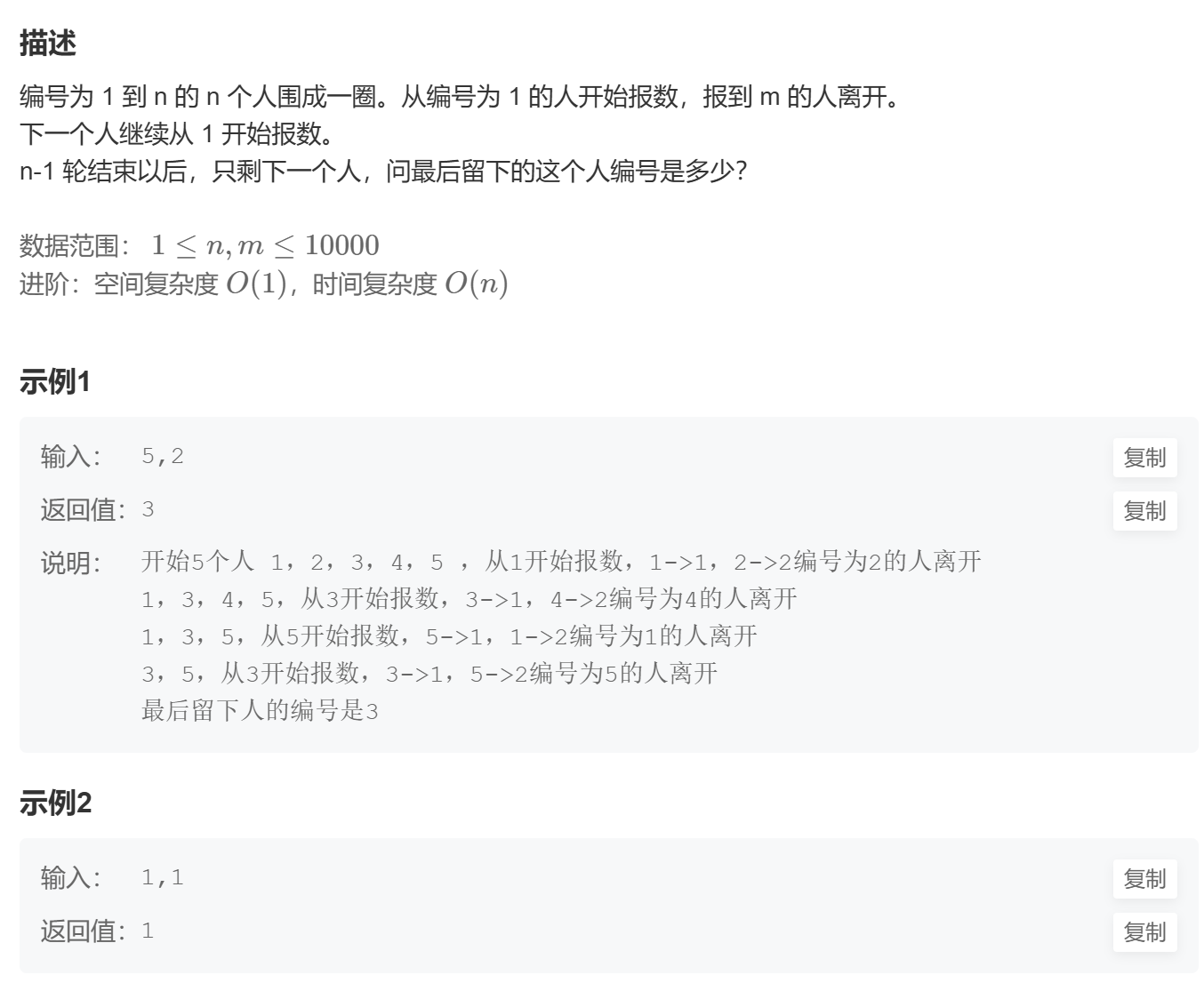 在一个环形链表中,定义两个指针变量顺着链表走,每走到m就销毁掉这个节点。到最后,链表会只剩下一个节点,指向它自己。