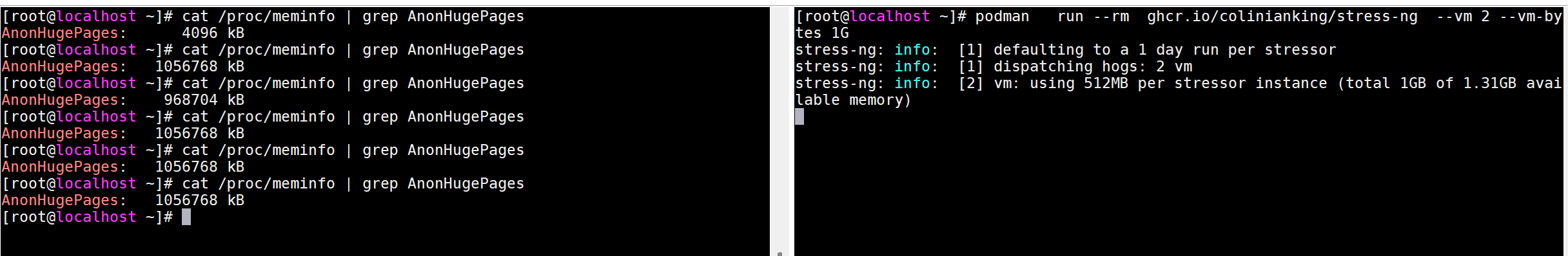 可以看出系统初始被被内核自动合并为 2MB 巨页的内存为4096 kB,后面执行stress-ng 压测后,被自动合并的内存页明显上升了。