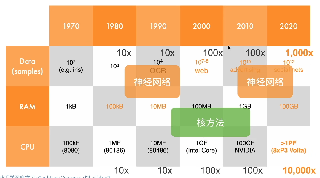 - 2012 年 AlexNet 之后,GPU(图中的 NVIDIA 100GF)开始大规模应用。当数据量达到