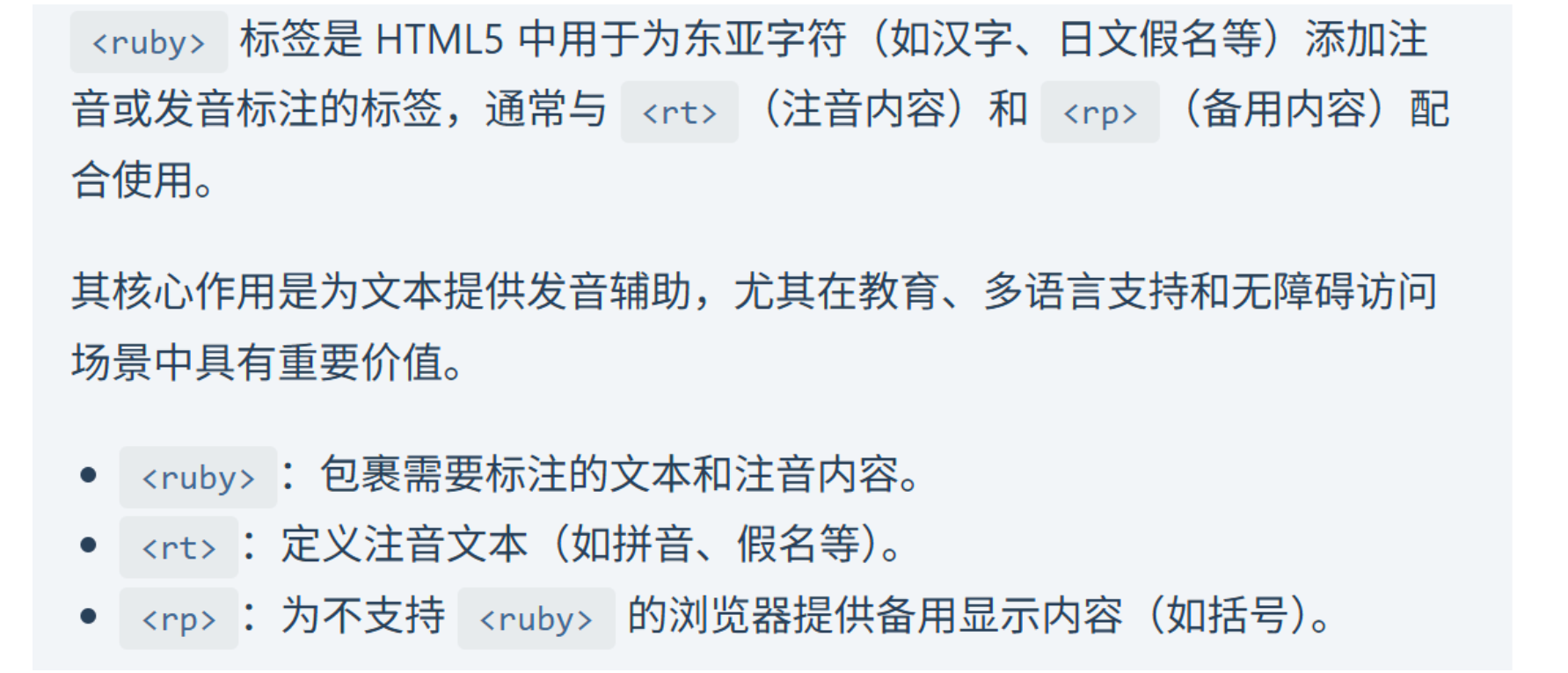 <ruby> 基础文本 <rp>(</rp><rt>注音内容</rt><rp>)</rp> </ruby>