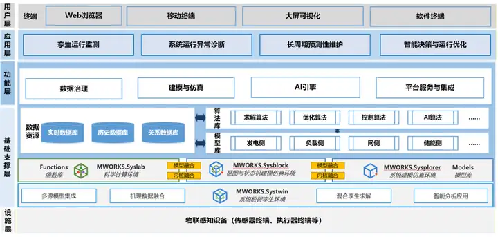 **同元软控"电力能源系统数智运维解决方案"**基于新一代科学计算与系统建模仿真平台MWORKS构建,面向发电、输配电、储能、氢能等场景,支持设备级、系统级和区域级应用。方案围绕数字孪生体构建、虚实映射、协同运行、可视化交互与应用服务,形成覆盖建模、监测、预测、优化和决策支撑的数智运维能力体系,助力能源系统实现全生命周期数字化运维与持续优化。
