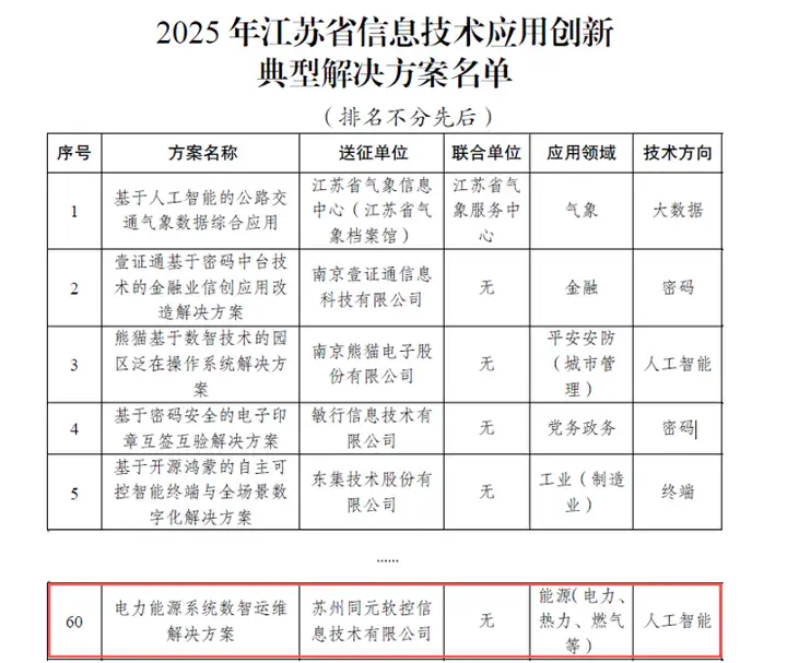 在新型电力系统建设持续推进、能源行业加快向数字化智能化转型的背景下,同元软控面向复杂能源系统运行管理需求,构建了覆盖建模、仿真、监测、预测、优化与决策支撑的电力能源系统数智运维解决方案。该方案成功入选"2025年江苏省信息技术应用创新典型解决方案"。