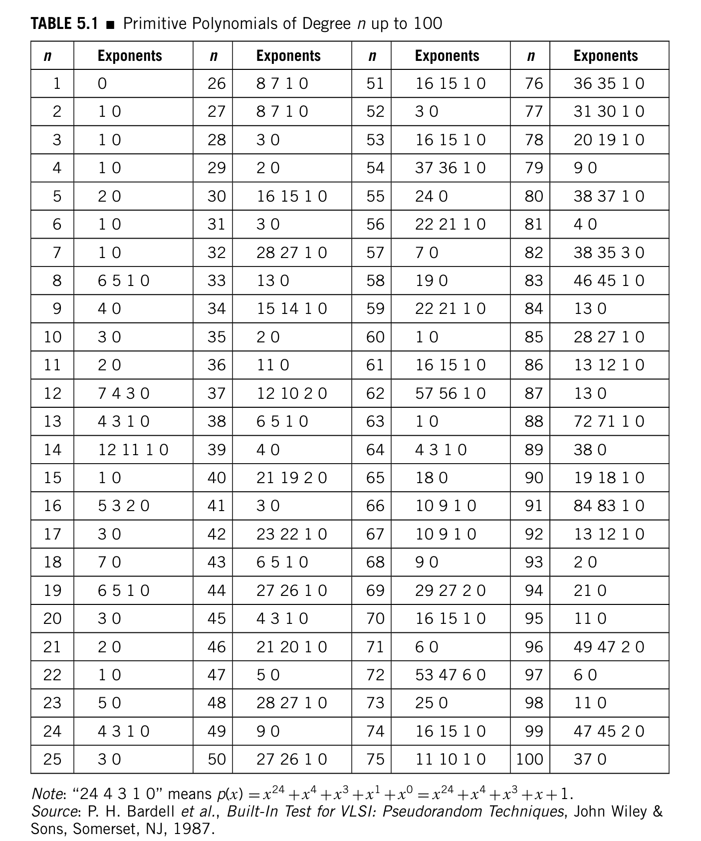 下表列出了次数不超过100的初代多项式的一个集合,它们可以用于构建最小长度的LFSR。还有一些其他的多项式可以参考一些文献得知。