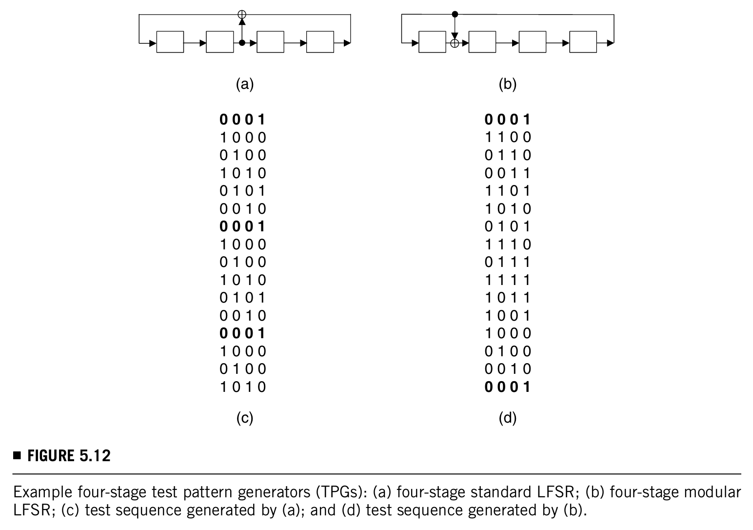 如果S0是{0001},或者说,生成的测试序列如上面图c和d,因为c是在6个pattern后重复的,d是在15个pattern后重复的,那么LFSR的周期分别是6和15,进一步说明1+